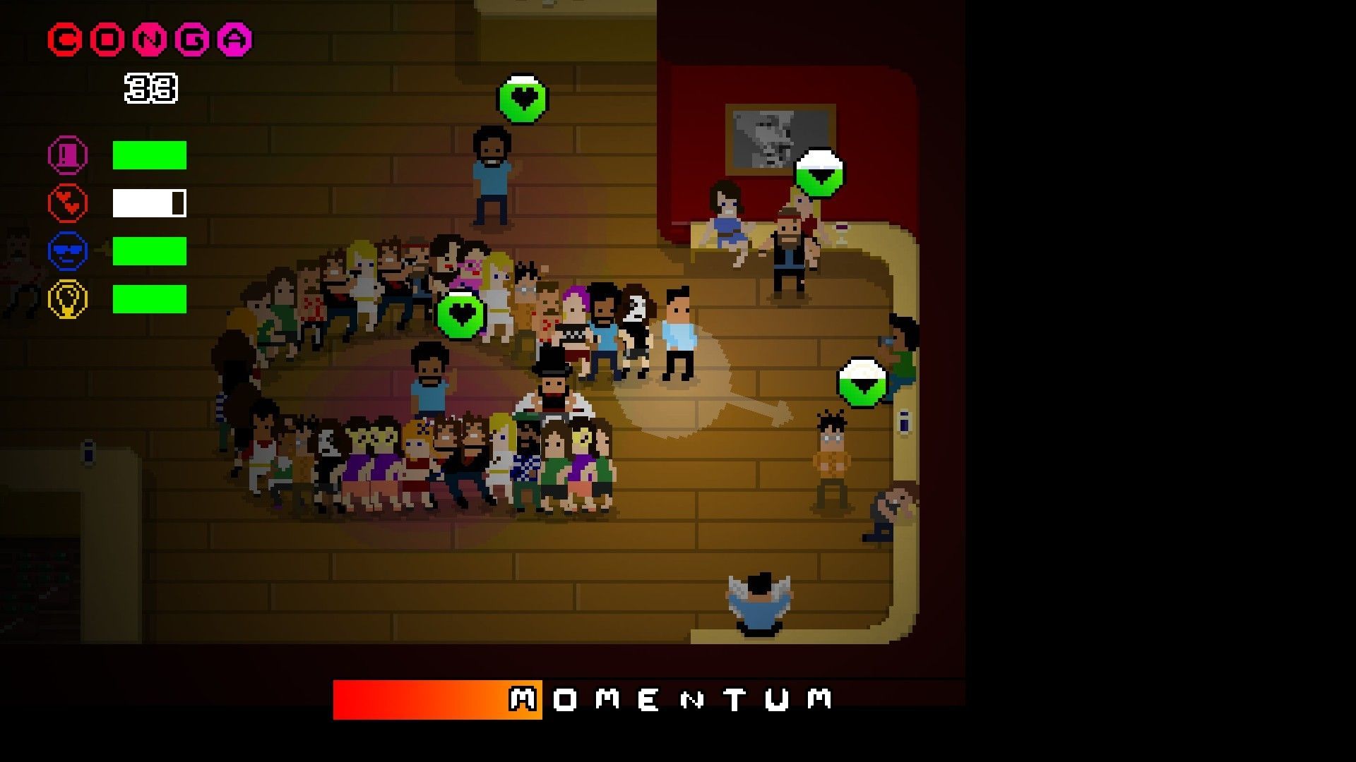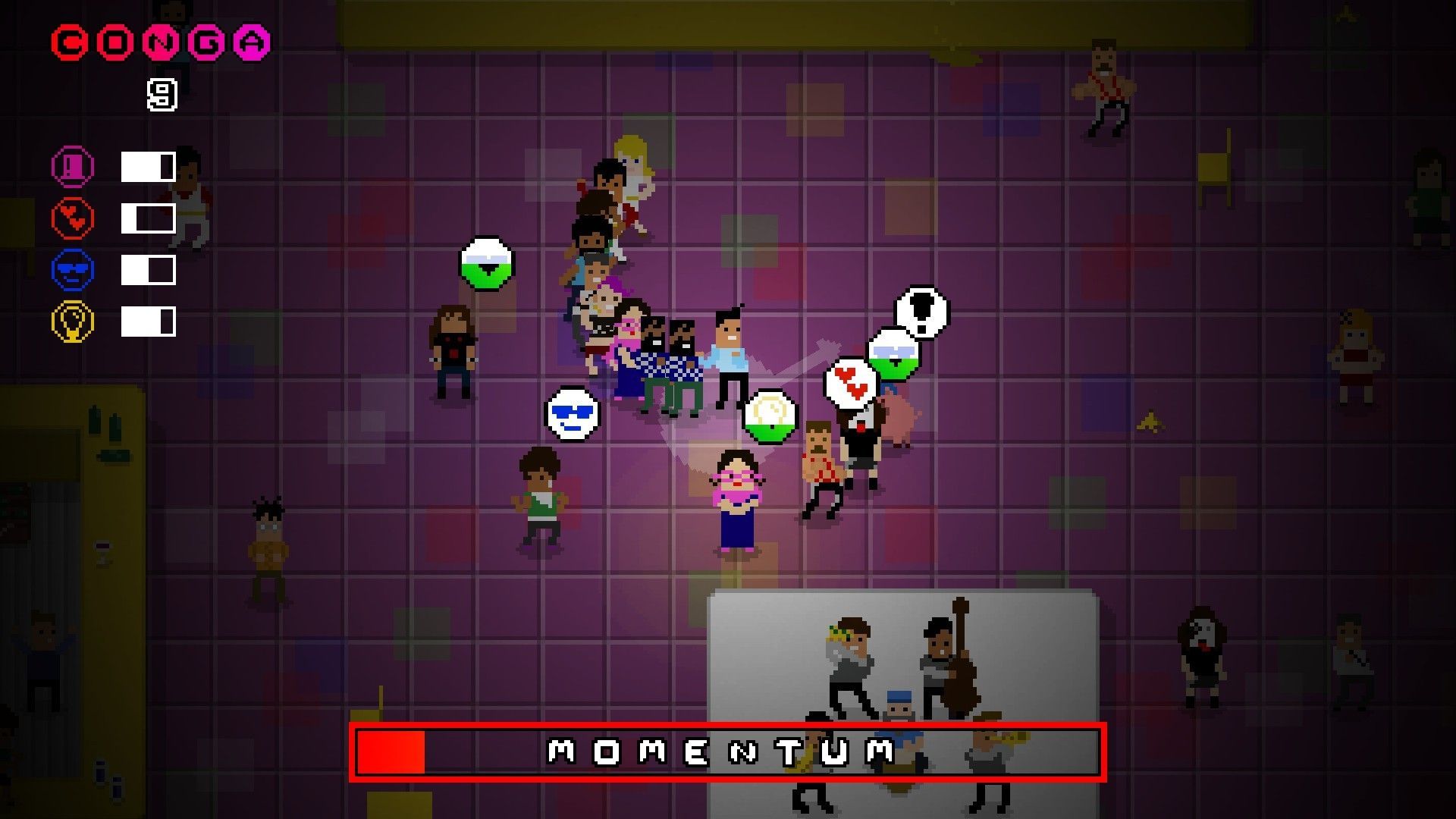 La barra de Momentum lo es todo en Conga Master. Es algo así como un indicador de nuestro ritmo, y mientras esté activa tenemos energía para seguir bailando. Si llega a cero, la partida se termina. Este Momentum desciende continuamente y la forma de recuperarlo es sumando personajes, y todavía mejor, conseguir combos que añadan a varios integrantes a la vez.