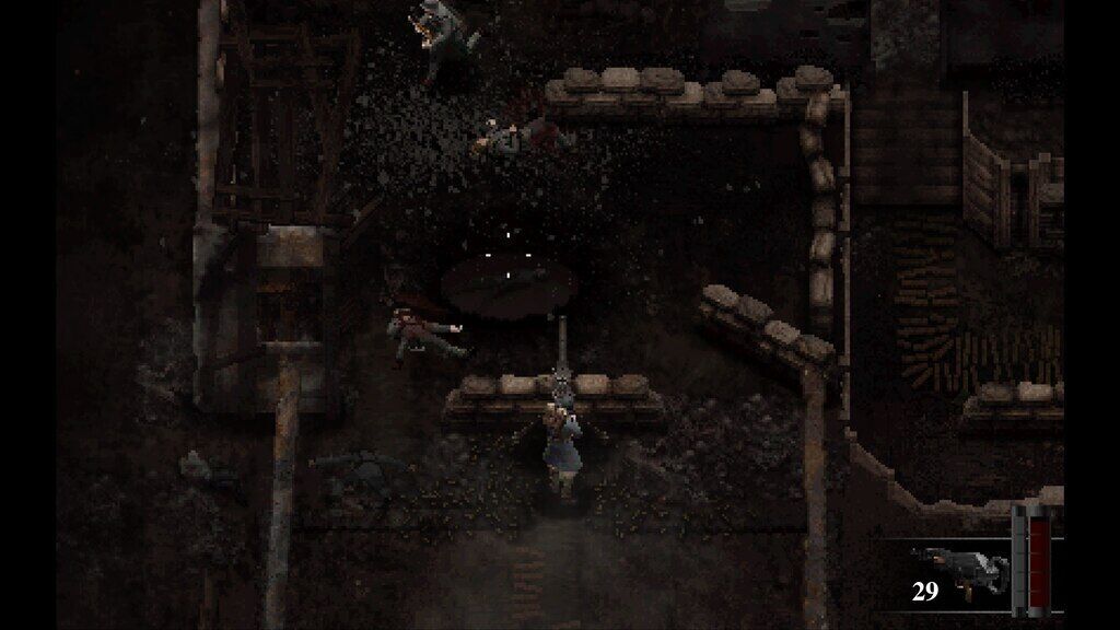 Conscript trabaja desde una perspectiva cenital. Puedes correr, pero durante un tiempo muy limitado. Si se agota tu resistencia, te moverás aún más lentamente hasta que te recuperes totalmente. Tienes un botón para la esquiva, fundamental para evitar ataques enemigos. Y, obviamente, tienes un botón para apuntar y otro para disparar. La dirección del disparo la manejas con el joystick derecho, y André temblará mucho o poco dependiendo del momento en el juego en el que nos encontremos.