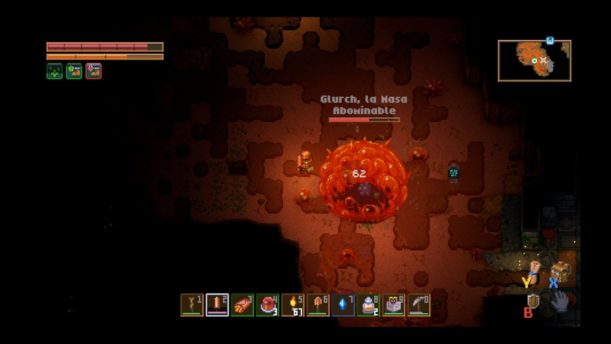 Terraria tiene la ventaja de más de una década de desarrollo, y en Core Keeper han intentado ofrecer una alternativa que parezca fresca. Ya solo la perspectiva cenital cambia totalmente la dinámica. Los tres primeros jefes, que se encuentran relativamente cerca del punto central en el que apareces, sirven para establecer la dinámica que seguirás durante el resto de la partida. Una vez derrotados, dejarán caer una gema que te permitirá desbloquear tanto objetos más poderosos como formas de localizar al resto de jefes. Una vez tienes las tres gemas, una por jefe, se "desbloquea" la zona principal del juego, con muchos más biomas, objetos y posibilidades por descubrir. En total, en Core Keeper hay 11 jefes obligatorios para completarlo y unos cuantos más opcionales. Para aquellos que, de nuevo, han agotado las posibilidades de Terraria, Core Keeper sabe captar muy bien su esencia en estos encuentros para ofrecerte batallas dinámicas. Bien es cierto que a nivel de habilidad hay algunas que no están a la altura de otras, más épicas, y algunas pueden ser "explotadas" con trucos para hacerlas más asequibles de lo que deberían ser. Pero, por lo general, son la columna vertebral de la progresión.