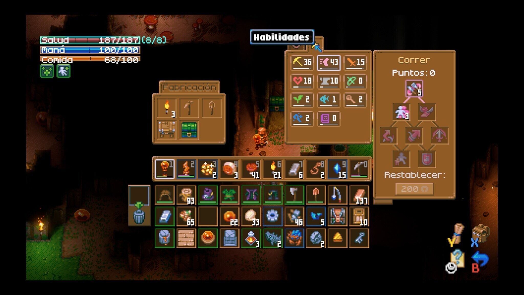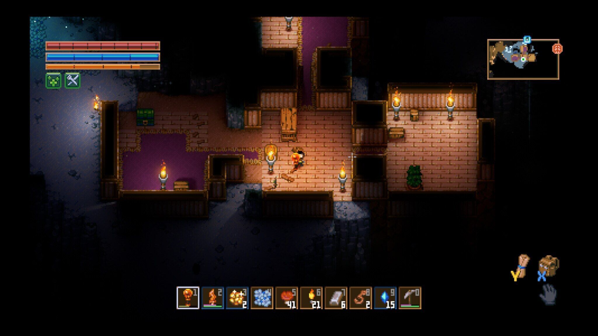 ¿Qué decir del resto de sistemas? La realidad es que existe un montón de contenido para entretenernos. Plantar cultivos y cocinarlos es tan sencillo como mezclar dos ingredientes y ver qué pasa. Es intuitivo, y hay componentes mágicos que permiten potenciar pasivos de ataque y defensa que se vuelven fundamentales a la hora de explorar. Lo mismo ocurre con la parte de minería e ir descubriendo biomas. Al principio, la dinámica de pico y pala hace que parezca una labor titánica desbloquear el resto del mapa; una vez obtienes objetos que mezclan ataque y minería, como el martillo, se vuelve muy gratificante encontrar hasta el último bloque disponible en la partida.
