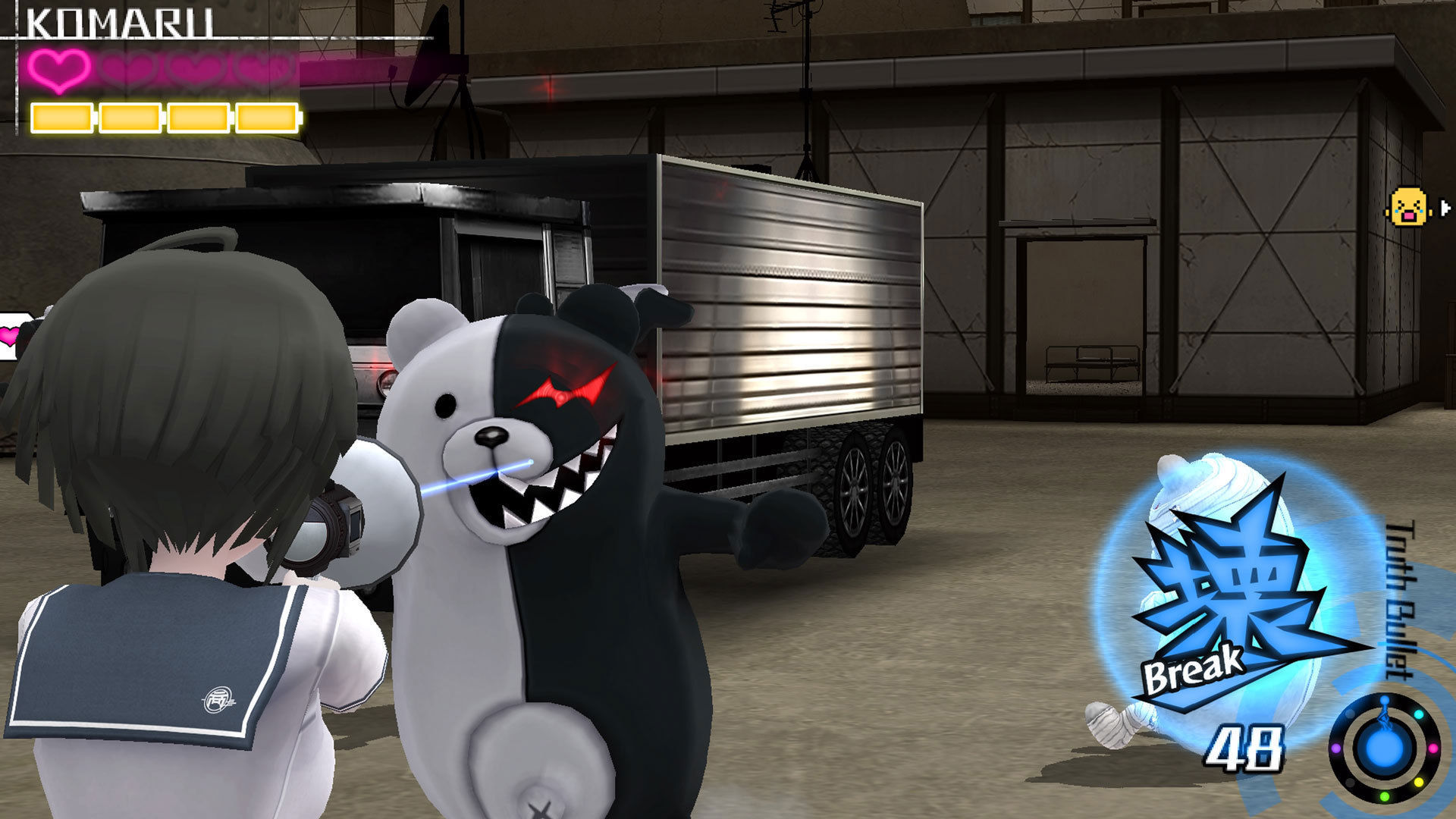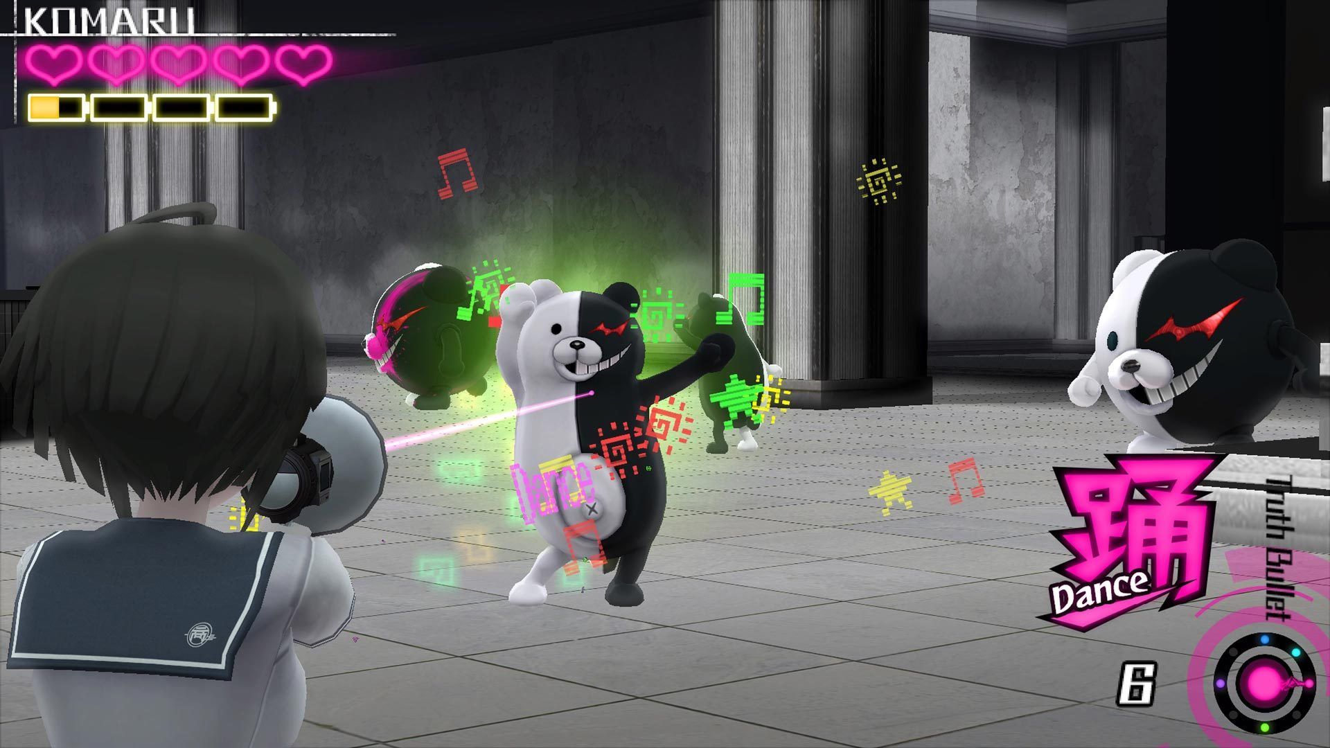 La aventura está protagonizada por heroínas: Komaru es la principal y se encarga de la parte de disparos. El arma que usamos es la especie de megáfono que se equipa con balas de diferentes efectos secundarios, tanto para derrotar a los Monokuma como para despejar los obstáculos del escenario. Durante los primeros compases por ejemplo disponemos de una bala que activa mecanismos eléctricos, ideal para encender motores, activar paneles o mover vehículos con batería. Otra deja bailando a un robot –distrae a los enemigos- y así hasta un total de ocho tipos. Estas balas también se pueden reforzar con ítems, y existe un sistema de habilidades que añaden un poco de profundidad a la personalización.
