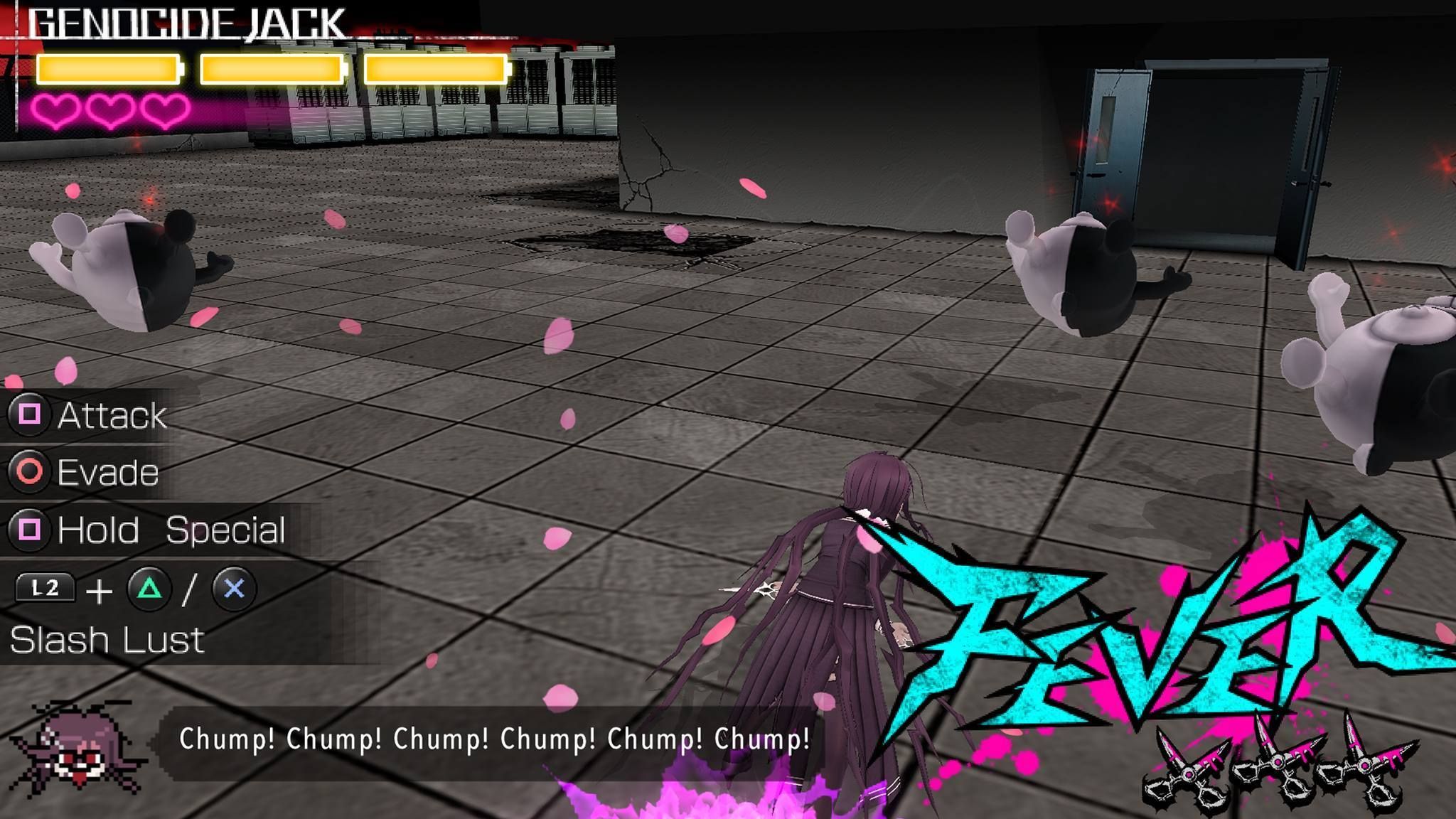Toko Fukawa nos acompaña a lo largo del juego para dar conversación y ayudar con su alter ego Genocide Jill. Toko no es precisamente el personaje más adorable del original, más bien lo contrario, pero al menos se ha respetado con coherencia su personalidad. La mecánica consiste en alternar a su control durante un tiempo limitado, en el que es inmortal, para atacar cuerpo a cuerpo con sus famosas tijeras. Igual que su compañera, tiene un perfil personalizable para aumentar el número de combos, rango de daño y otras mejoras. Incluso dispone de ataques especiales que acaban con grupos de enemigos. Toko es algo así como la transformación temporal en un slash´em up y se deberá ahorrar para las situaciones más comprometidas.
