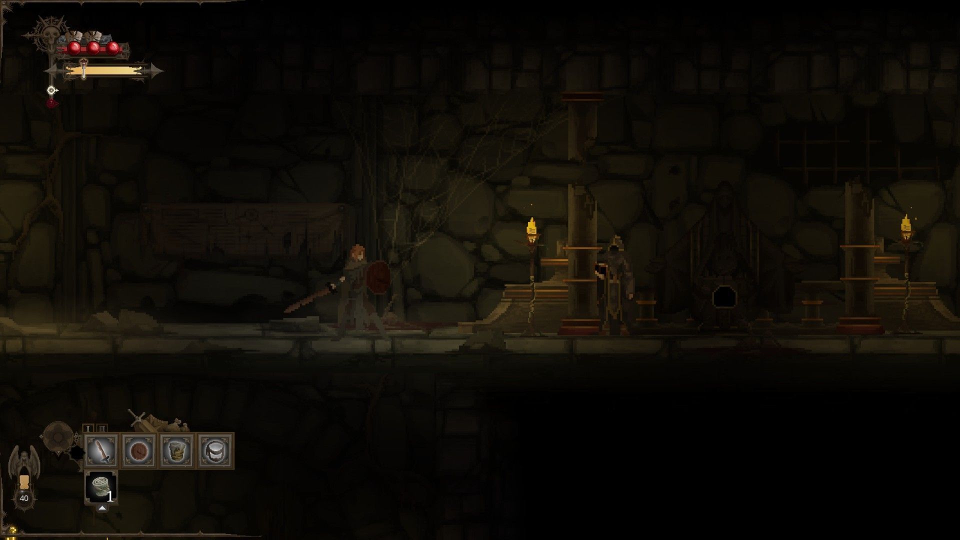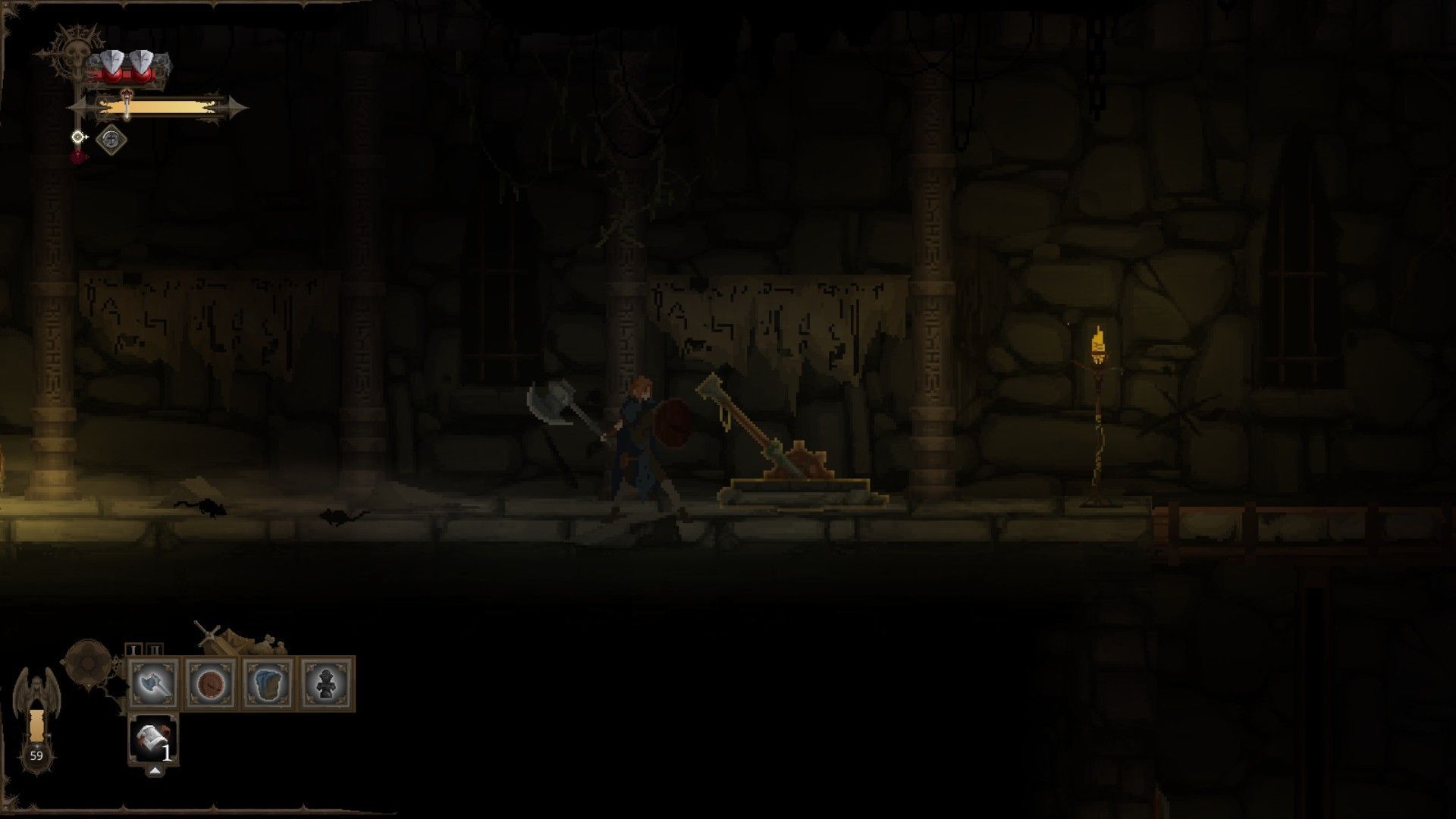 Esto último es importante, ya que la muerte nos hará perder todo nuestro inventario, por lo que nos tocará volver a armarnos si queremos afrontar las batallas que nos esperan con ciertas garantías. Al comienzo apenas tendremos una simple espada y escudo de baja calidad para forjar, pero a medida que avancemos desbloquearemos nuevas armas e incluso ítems iniciales. Lo bueno es que no hacen falta materiales para fabricar este equipamiento, aunque solo podremos escoger una única combinación de ítems cada vez.