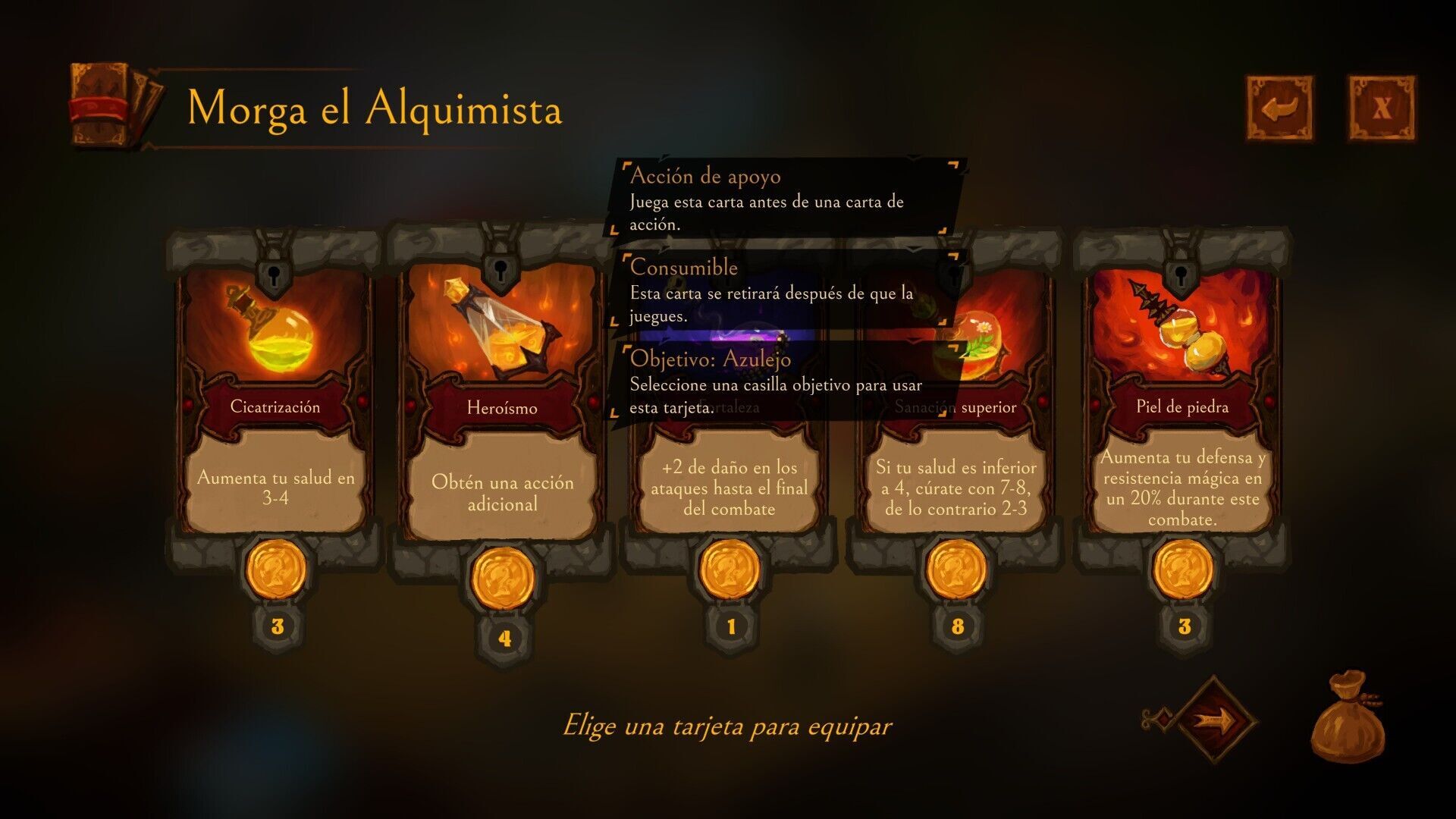Por suerte, hay todo un sistema de cartas para conseguir mejoras activas o pasivas, tales como aumento en el daño, subida de probabilidades, aumento de salud, acciones adicionales o consumibles, y esto cuesta esas valiosas monedas que vamos a ir descubriendo a lo largo de las mazmorras. ¿Mantener equilibrado a todo tu grupo o invertir los ahorros en tus favoritos para romper más fácilmente la defensa rival? Por lo general, la estrategia ofensiva es la más recomendable.