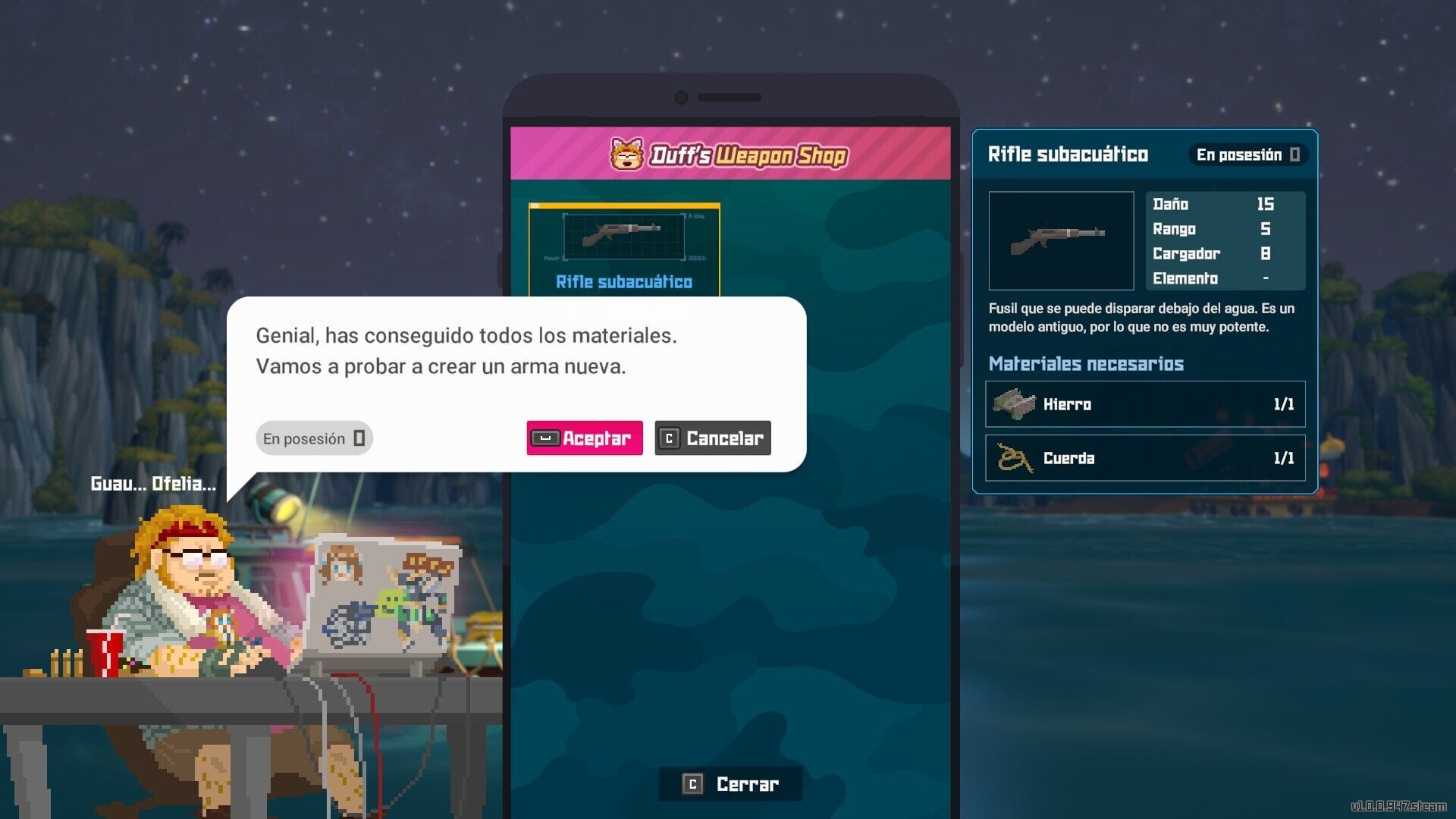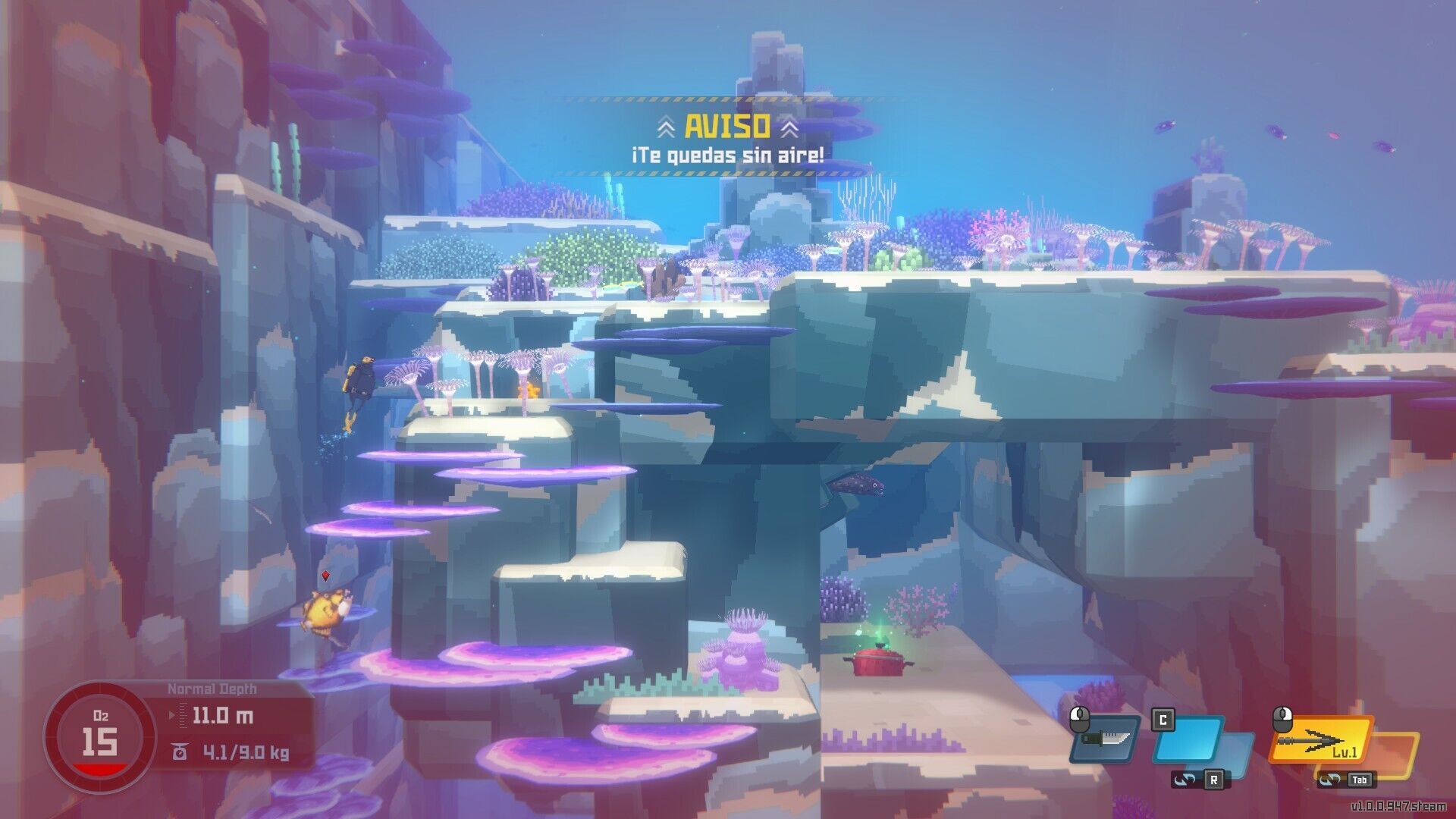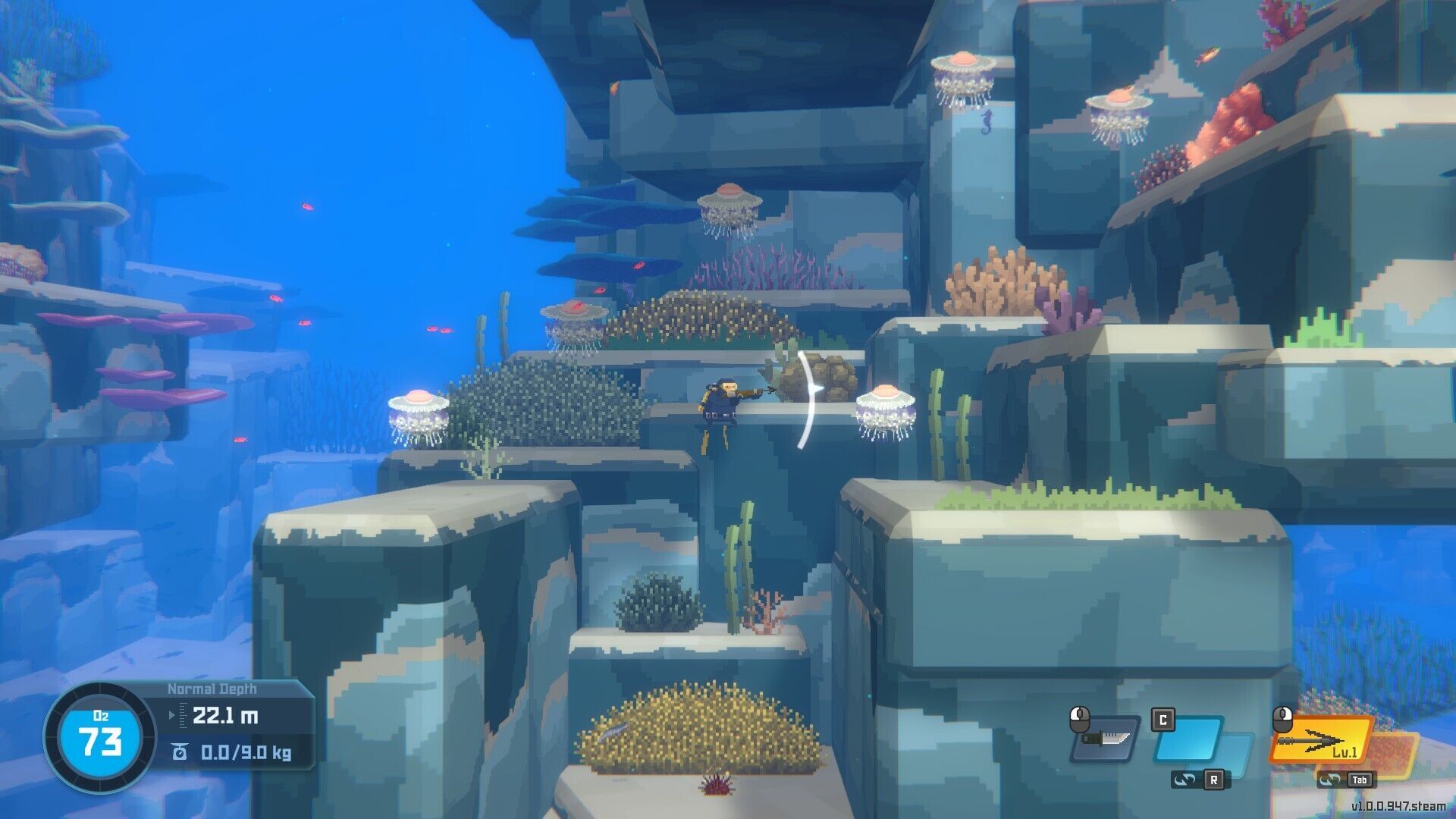 A simple vista tendríamos un sencillo e inofensivo juego de submarinismo con mecánica roguelike –el fondo marino cambia con cada zambullida- que nos hace cumplir una serie de objetivos con cada inmersión, desde conseguir cantidades de un tipo de pescado o condimentos a recursos de otro tipo. ¿Cómo? Empezaremos con un cuchillo y un arpón, aunque a medida que progresamos –de ahí ese desarrollo cíclico de un roguelike- vamos a conseguir armas más potentes, trajes que nos permitan sumergirnos a más profundidad y otro equipamiento de más calidad. Poco a poco el juego se va abriendo con más libertad de exploración: más oxígeno, más espacio en el inventario, armamento con veneno… Ya imaginarás por dónde van los tiros.