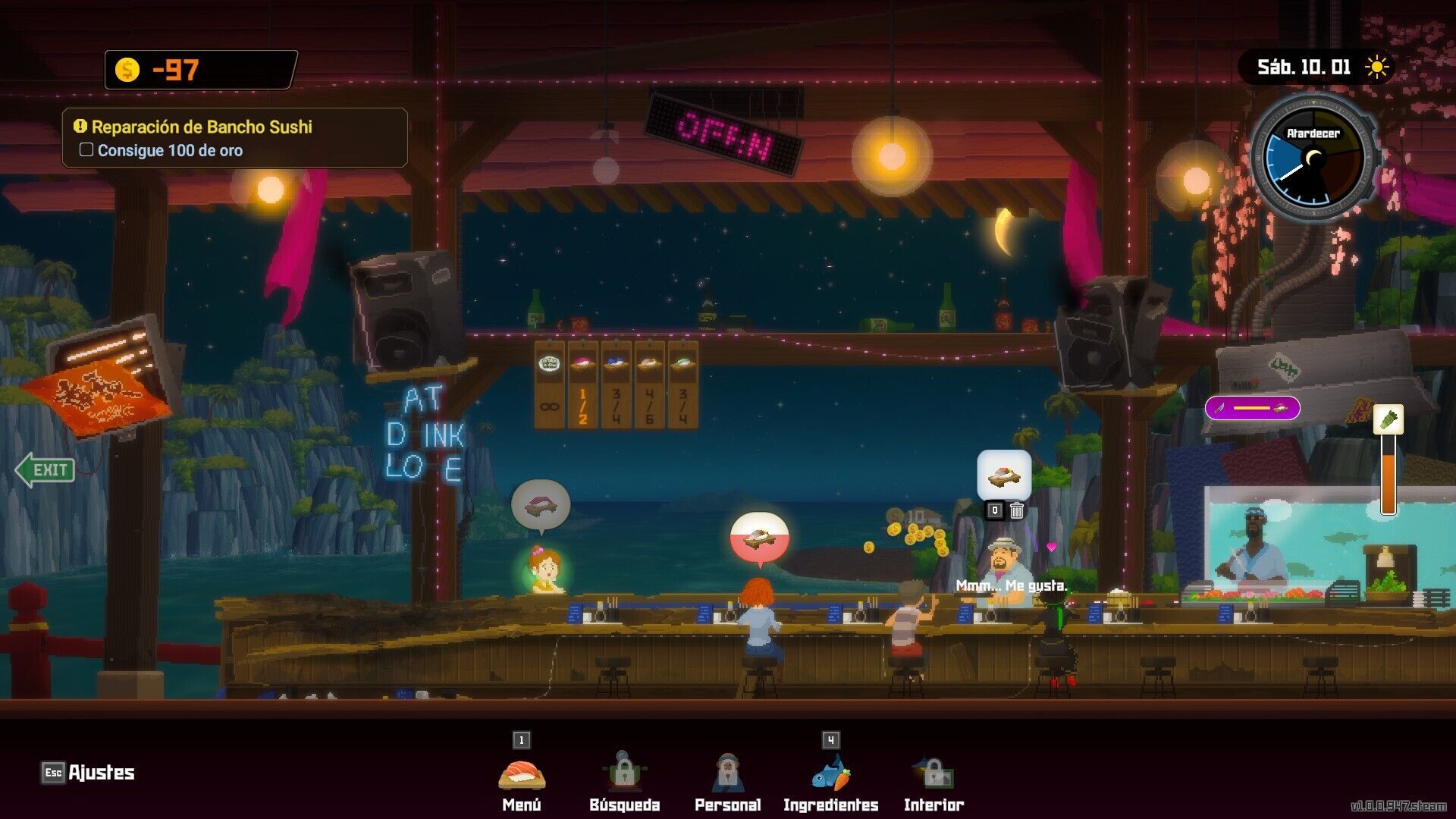 Después de la sesión en la Fosa Azul llega el momento de gestionar el negocio, primero como un camarero raso. Este es otro minijuego en sí mismo y nos hace confeccionar el menú de la noche con los recursos que hemos conseguido, mantener una economía saneada, distribuir los platos según entran los comensales –un poco estilo Diner Dash-, verter la bebida al punto exacto, limpiar la mesa, aprender nuevos platos, contratar personal, llevar una pequeña graja y en definitiva, hacer que este negocio, en el que al principio sólo nos preocupemos por llevar la comida a cada cliente, nos ponga en la piel de un auténtico empresario del sushi. ¡Y mucho más! Está repleto de otras actividades tan dispares como juegos de ritmo, carreras de caballitos de mar, fotografía submarina… Los aspectos roleros son el cemento entre estas mecánicas.