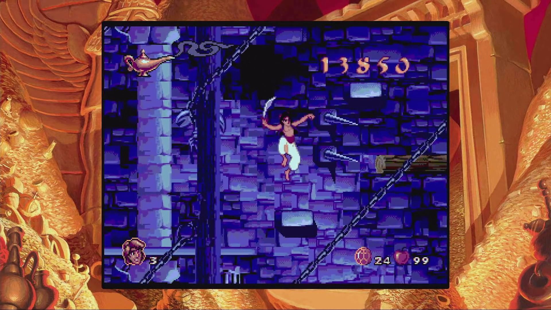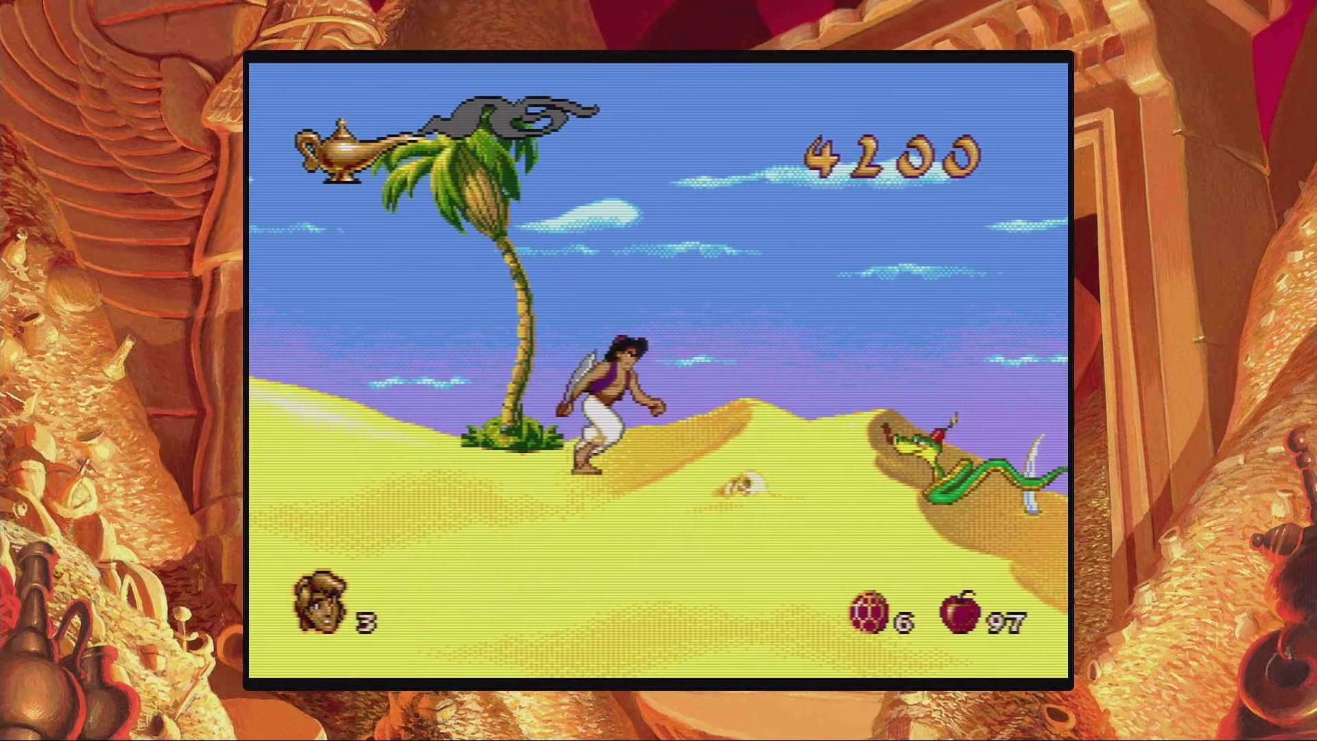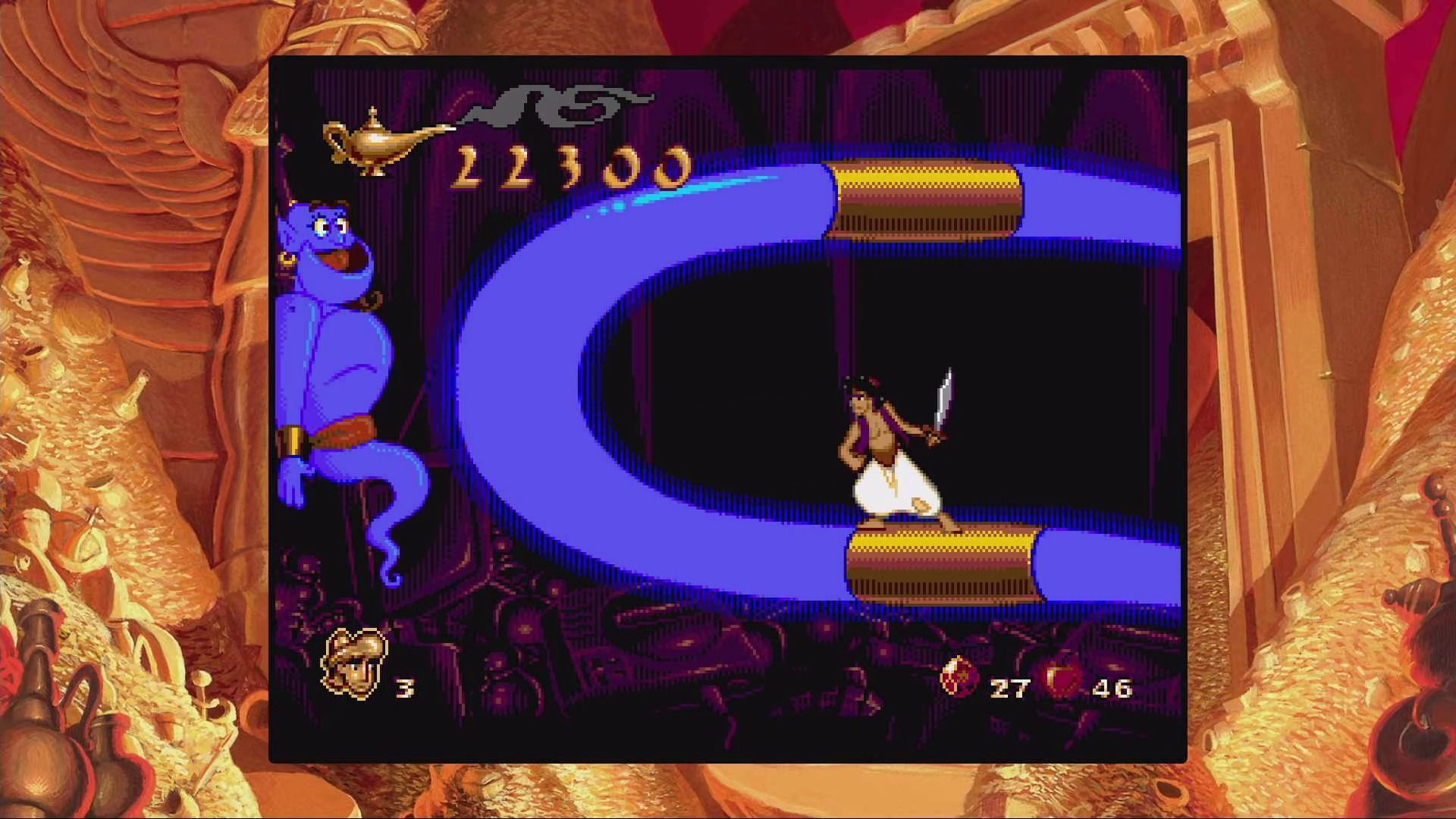 Centrándonos ya en lo que son los juegos incluidos, lo primero que tenemos que lamentar es la ausencia de la versión de Super Nintendo de Aladdín. Como bien sabréis, fue un título completamente diferente y que nada tiene que ver con el de Mega Drive, ya que fue desarrollado por Capcom y diseñado ni más ni menos que por Shinji Mikami, el padre de Resident Evil. Por desgracia, la licencia de este juego está actualmente en un complicado limbo legal que ha impedido su rescate para la ocasión, dejando al pack muy cojo y restándole muchísimo valor al impedirnos revivir una de las mayores rivalidades que jamás ha contemplado la industria de los videojuegos.