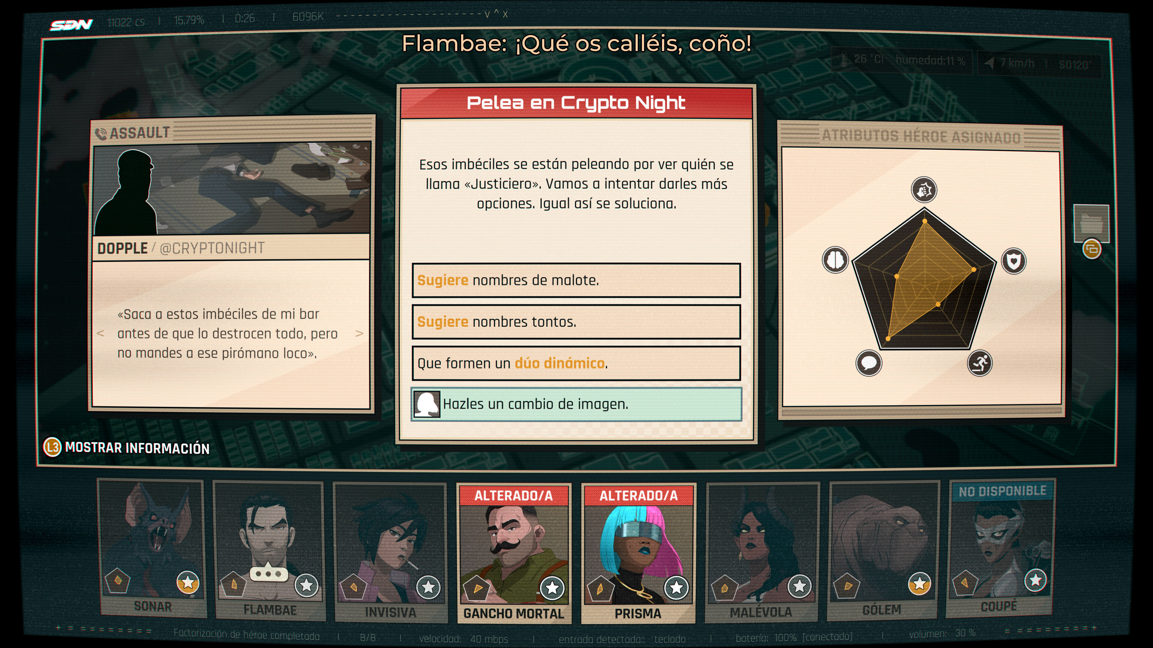 Pero, como decíamos, el Equipo Z un grupo de inadaptados que no paran de hacerse jugarretas. Se hacen la zancadilla entre ellos, algunos no quieren colaborar con otros, a veces nos mandarán al cuerno y se irán a descansar, y otras veces irán ellos a una misión porque les ha dado por ahí y nosotros tendremos que sufrir las consecuencias. La planificación es importante, pero más aún es lidiar con las situaciones que se nos presentan y asumir que este es un trabajo agobiante donde nos veremos sobrepasados constantemente. Conforme pasan los capítulos, el roleo, la gestión y los minijuegos de hackeo alcanzan bastante complejidad (sin dejar de ser un videojuego accesible para todo el mundo), y queda patente que nuestros triunfos y fracasos aquí afectan a la historia.