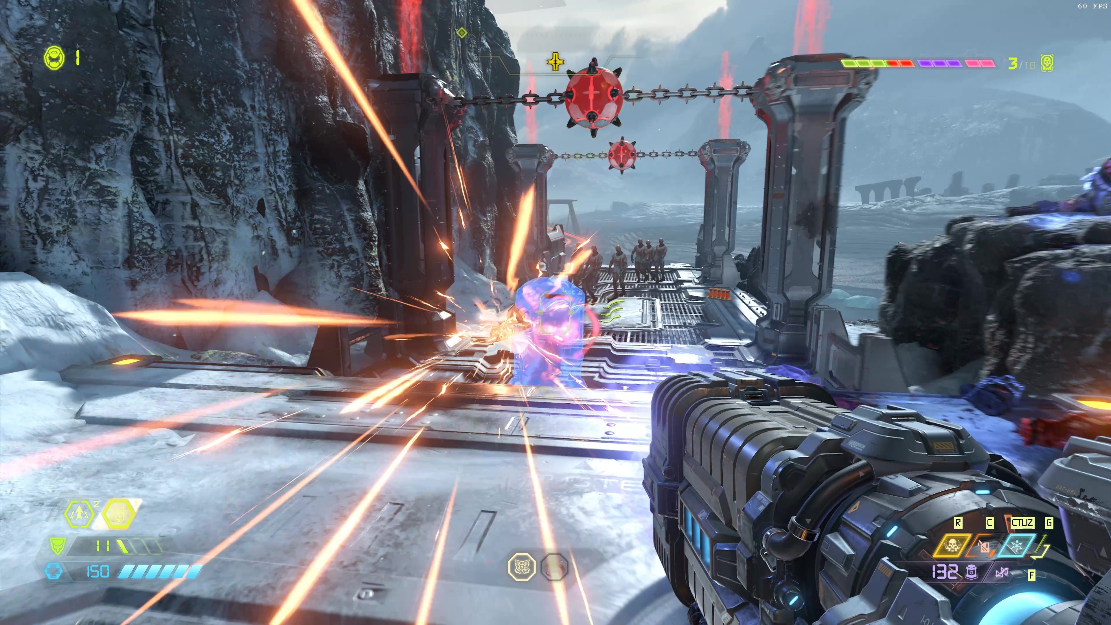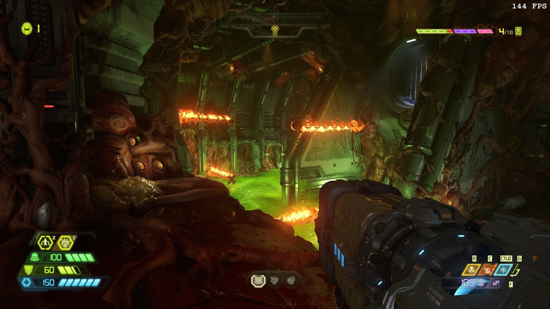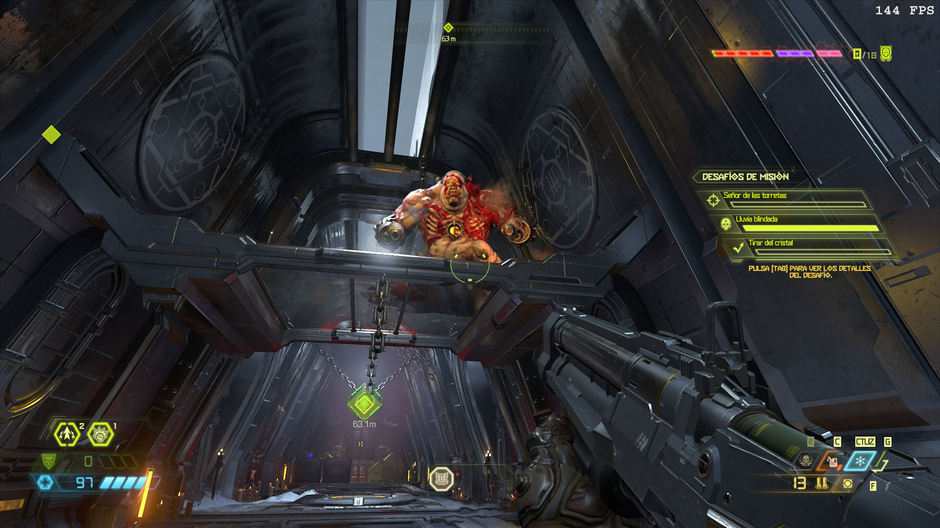 Como muchos recordaréis, ejecutar a los enemigos cuando se quedan casi sin vida (y se resaltan con unos llamativos colores) nos vale para que lancen bolas azules para recuperar salud, si los cortamos utilizando la motosierra (siempre que la tengamos con gasolina) recuperaremos munición y si los quemamos utilizando el lanzallamas nos dan armadura. Alternar entre estas tres mecánicas en mitad de cada batalla y en función de nuestras necesidades es uno de los factores clave y decisivo si queremos sobrevivir al infierno que propone.