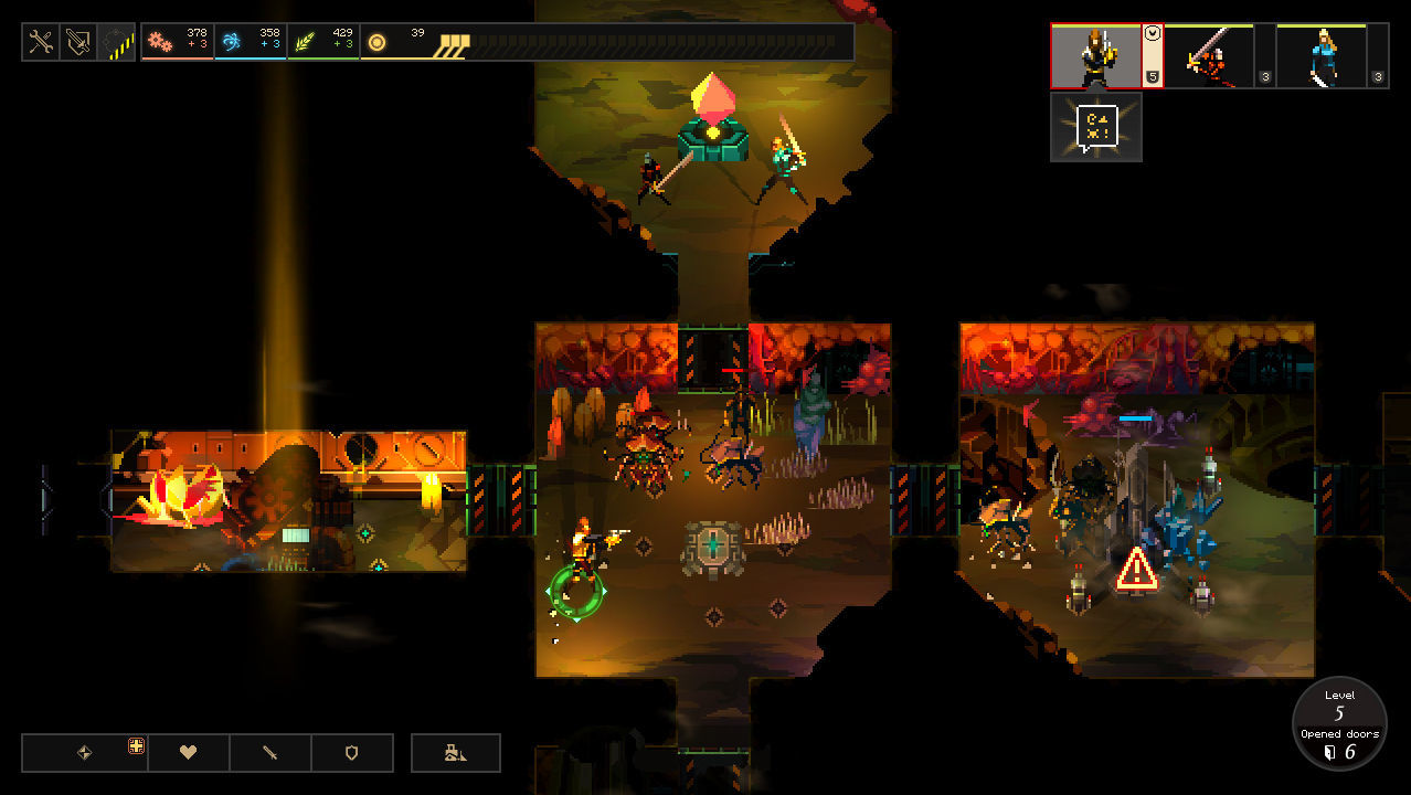 La cuestión está en que mientras descubrimos el mapa y adquirimos armaduras, plantamos determinados artefactos que generan más recursos o damos energía a las salas, las oleadas de enemigos irán llegando de manera dosificada, con intención tanto de matar a nuestros personajes –la muerte es permanente para la partida, tendrás que apechugar en siguientes niveles sin su ayuda- como de destruir el cristal, que supone el "game over" definitivo. La parte de estrategia viene porque no actuamos directamente controlando a nuestras unidades, es decir, indicamos la habitación a la que deben desplazarse, pero luego ellos actúan según la situación, por ejemplo, si hay enemigos a la vista, dispararán automáticamente –no es un shooter de vista superior- o recaudarán todo el material de la habitación.