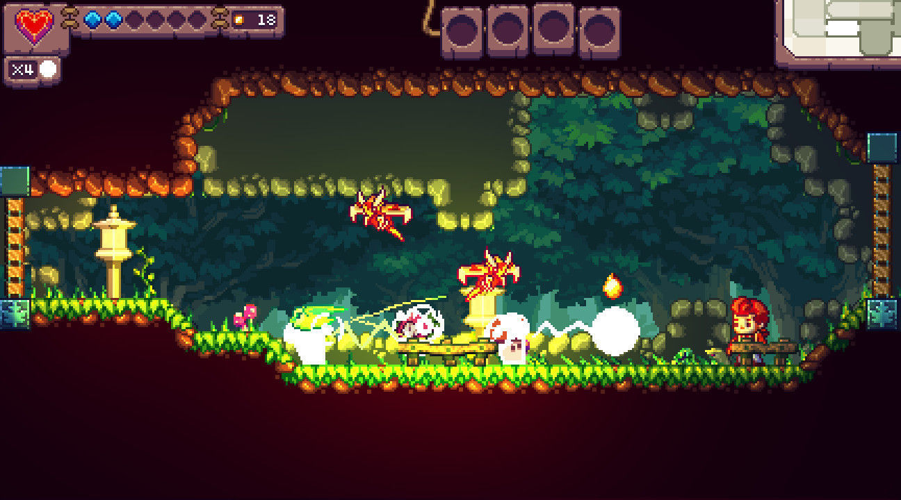 No se conforma con lo que podríamos decir que es un metroidvania pixel art al uso, sino que le añade ese elemento roguelike que tanto le gusta a muchos de los jugadores actuales. Esto tiene de ventaja que ofrece muchas más horas de juego, ya que cada vez que entremos en una fase nos encontraremos con un escenario distinto, pero como desventaja es que hay mucho menos trabajo y detalles en los niveles, ya que de alguna manera interviene el azar o la computación en lugar del trabajo de un diseñador dedicado a cuidar cada centímetro del mapa.