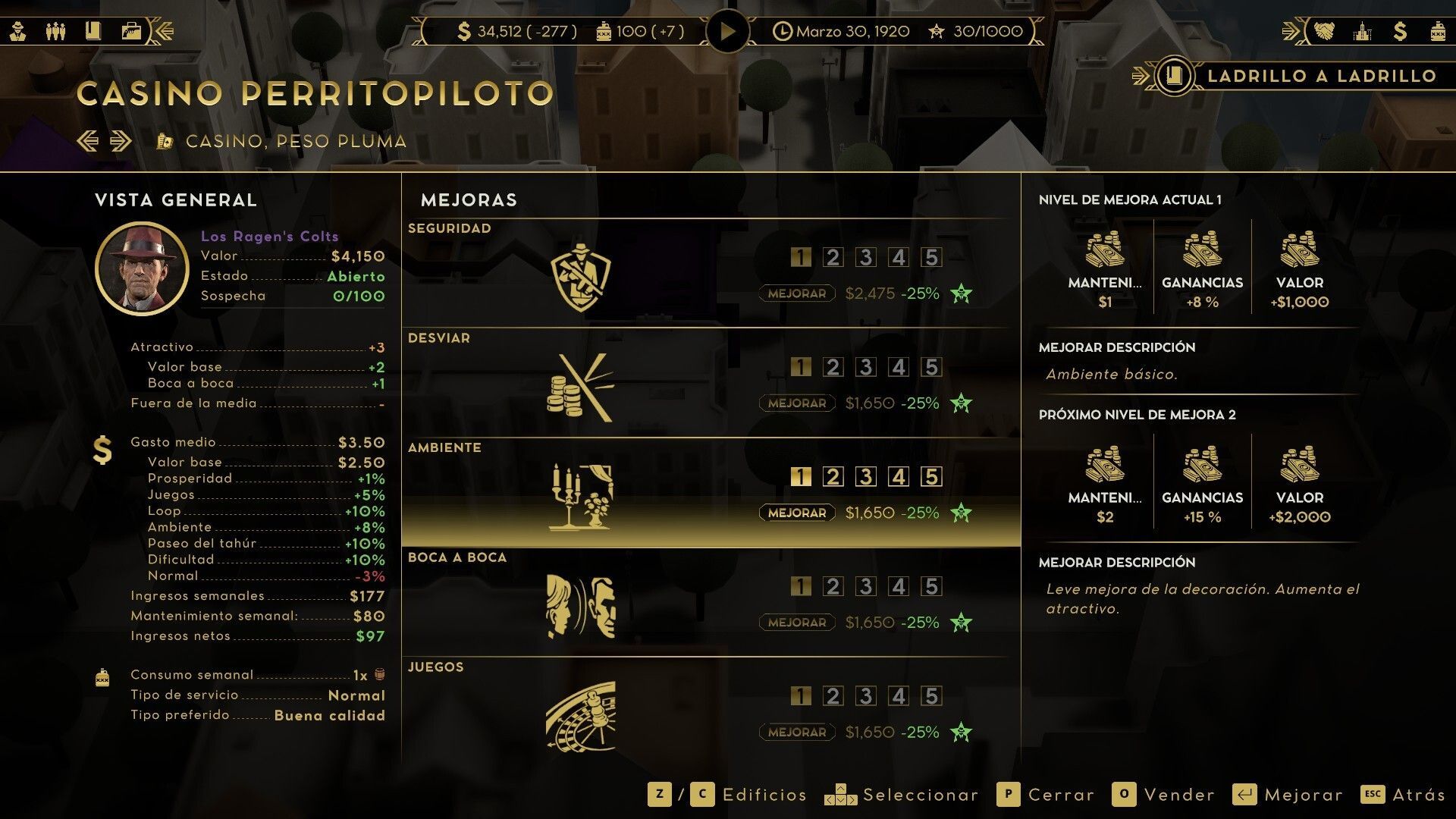 Se trata de un juego bastante libre en cuanto a la manera de progresar, pero el resumen es que debemos entrar en un ciclo de conseguir nuevos aliados, desde criminales de poca monta a asesinos experimentados, para fortalecer la seguridad de nuestros negocios y asaltar las destilerías o negocios rivales. A medida que progresamos la reputación mejorará y podremos contar con mejores miembros, desarrollar ventajas permanentes, y las reacciones del grupo variarán según nuestras decisiones tomadas en momentos clave. Existen multitud de sistemas para mejorar los bares y el ambiente, potenciar su seguridad, subir la calidad del alcohol… Claro, cuanto más crezca nuestro imperio, también los gastos serán mayores. Un simulador como los que ya conocerás, pero adaptado a la idiosincrasia de los gánsteres.