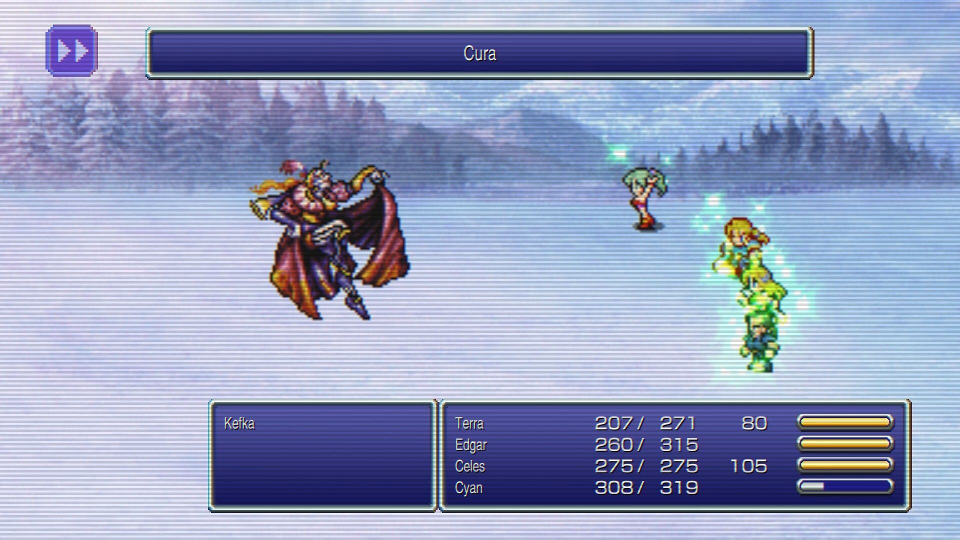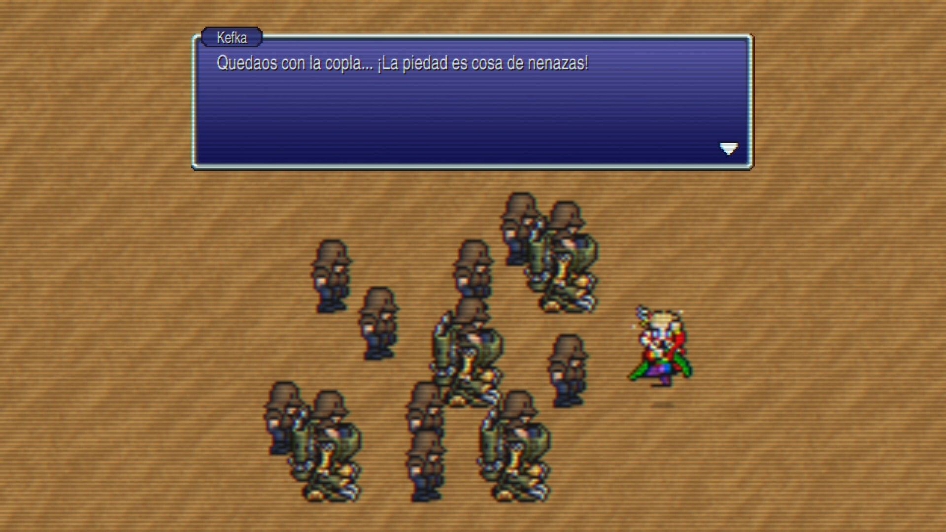 Ahora bien, no todo es perfecto y hay algunos detalles que si bien no le impiden ser la mejor versión que se ha lanzado hasta la fecha, sí que evitan que estemos ante la edición definitiva. Por un lado, se mantenido parte de la censura que sufrió en GBA, como la escena de la tortura de Celes, mientras que por el otro no se ha aprovechado para añadir los contenidos exclusivos que se incluyeron en dicha consola, así que no esperéis ni sus espers adicionales, ni sus dos superjefes ni sus dos mazmorras. Además, y de manera incomprensible, los créditos han sido eliminados de su secuencia de introducción, dejándonos con un vídeo de dos minutos que pierde todo su sentido y razón de ser.
