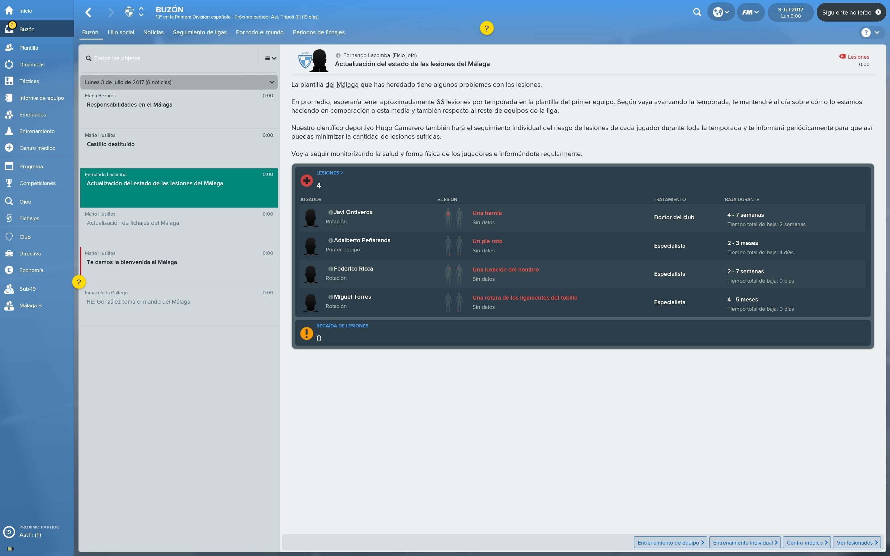 Si salud mental es importante, también lo es el aspecto físico, vital en jugadores de élite. Un jugador con una buena preparación física es un valor sólido en el campo, pero habrá ocasiones en los que tendremos que ser conscientes de que nada es perfecto, y que incluso haciendo los deberes en prevención, sufriremos lesiones en jugadores en nuestro equipo. En entregas anteriores acceder a la enfermería del club era un proceso un poco más oscuro y poco amistoso, invitándonos a navegar entre pestañas y opciones poco claras. Football Manager 2018 es más evidente, directo, y por consiguiente, más divertido en este aspecto. En la nueva edición podemos establecer una serie de prevenciones generales para los jugadores más propicios a caer lesionados, monitorizando el cansancio, la sobrecarga o evitando las recuperaciones forzadas que puedan hacer que algunos futbolistas recaigan en sus roturas o lesiones. ¿El resultado? El jugador vuelve a sentirse un entrenador en estas lindes, debiendo tomar algunas decisiones muy serias, incluso valorando si es necesario o no infiltrar a un jugador de cara a un partido muy importante.