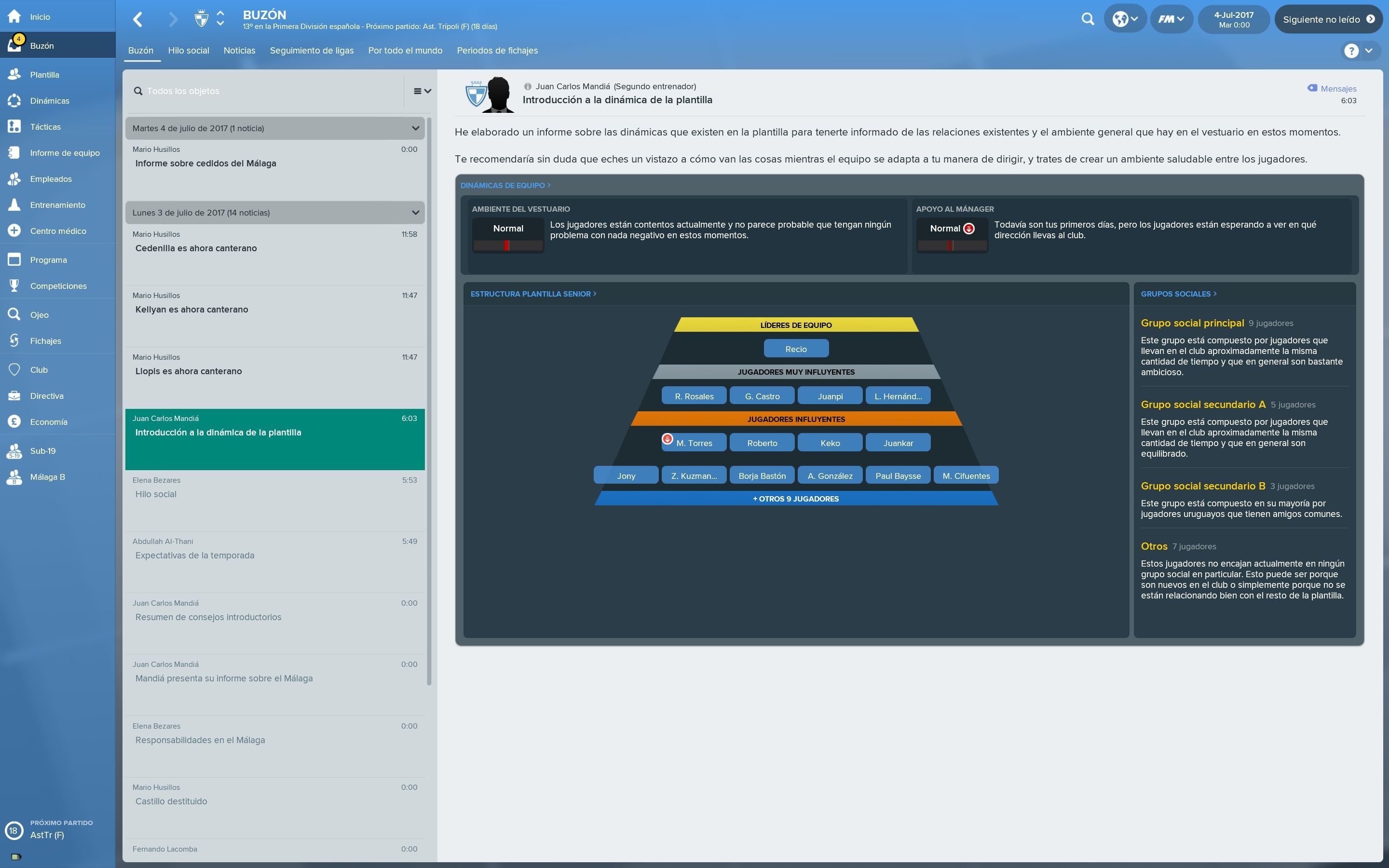Ahora, en Football Manager 2018 todo es más transparente y claro, y por lo tanto, de mayor importancia. Las dinámicas de grupo, sus relaciones y compenetración gozan de una relevancia inusitada en esta entrega. ¿Habéis escuchado eso de los clanes y los galones en los vestuarios de los clubs de fútbol más importantes de las ligas de mayor renombre en el mundo del balompié? Pues con esta revisión del sistema, entran en la partida. Ahora deberemos tener muy en cuenta la nacionalidad, la afinidad o aspectos que antes no tenían peso alguno, ofreciéndonos una verdadera sensación de gestión de vestuario y jugadores. Hablamos de tres pilares fundamentales: compenetración en el césped y el terreno de juego, amistad en el vestuario y opinión sobre nuestro rol como entrenador.