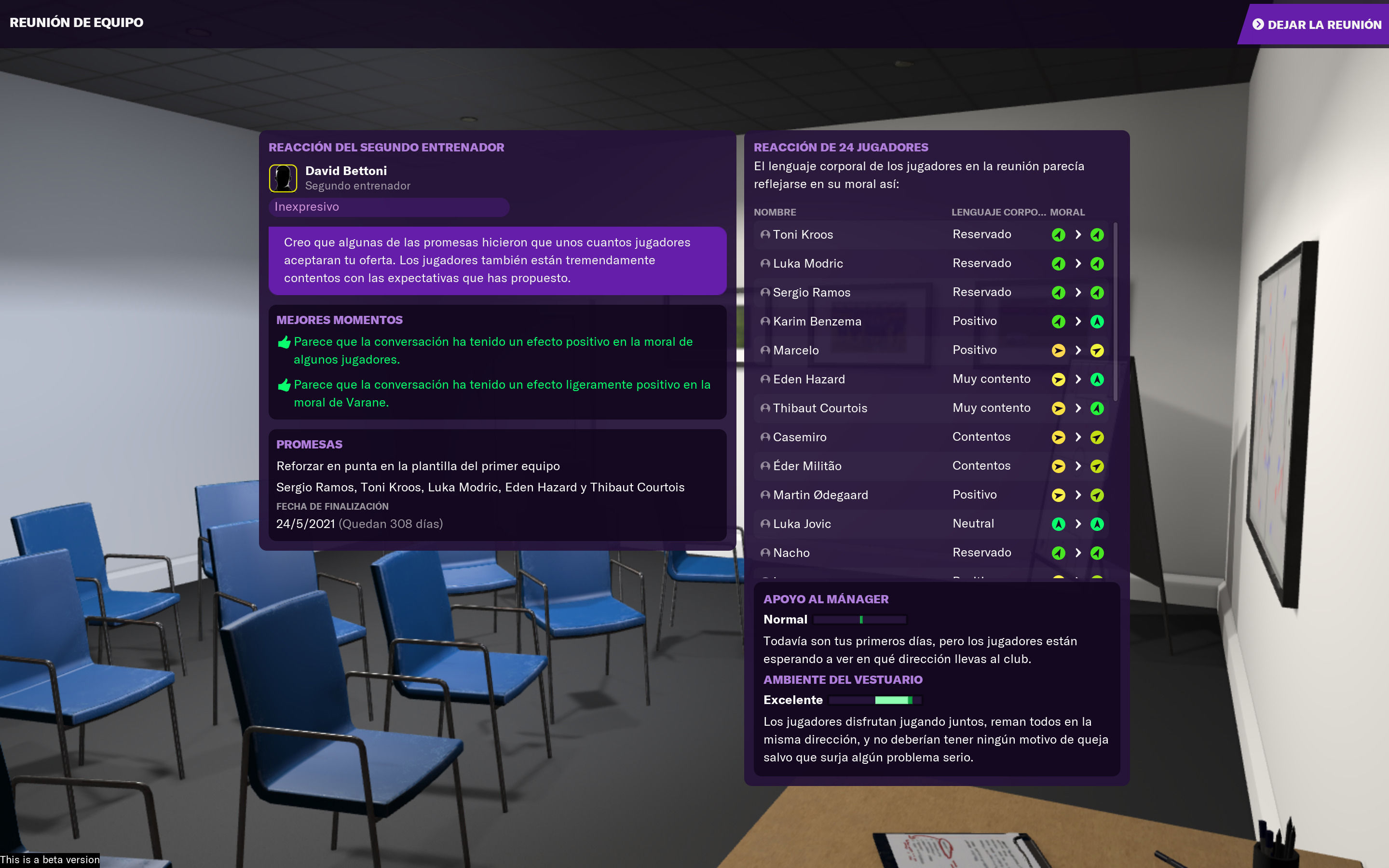 Se acaba la formalidad imperante en otras versiones, algo que agradecemos, y se aligera el tono de muchas reuniones, la gran mayoría intrascendentes, que nos causaban un gran tedio al largo plazo. Estos chats rápidos o conversaciones informales podrán ser con con jugadores de nuestro club de cara a algún tema en concreto de relativa importancia, debates de forma remota con jugadores cedidos, entrenadores rivales y periodistas, que podrán tener un acceso directo a nosotros de forma telemática sin tener que pasar por la clásica rueda de prensa. No os preocupéis, pues para que todo sea fácil de ver y comprender, Sports Interactive ha cambiado sutilmente la interfaz del videojuego en estos temas, la ha hecho más agradable, con una distribución lógica y comprensible.