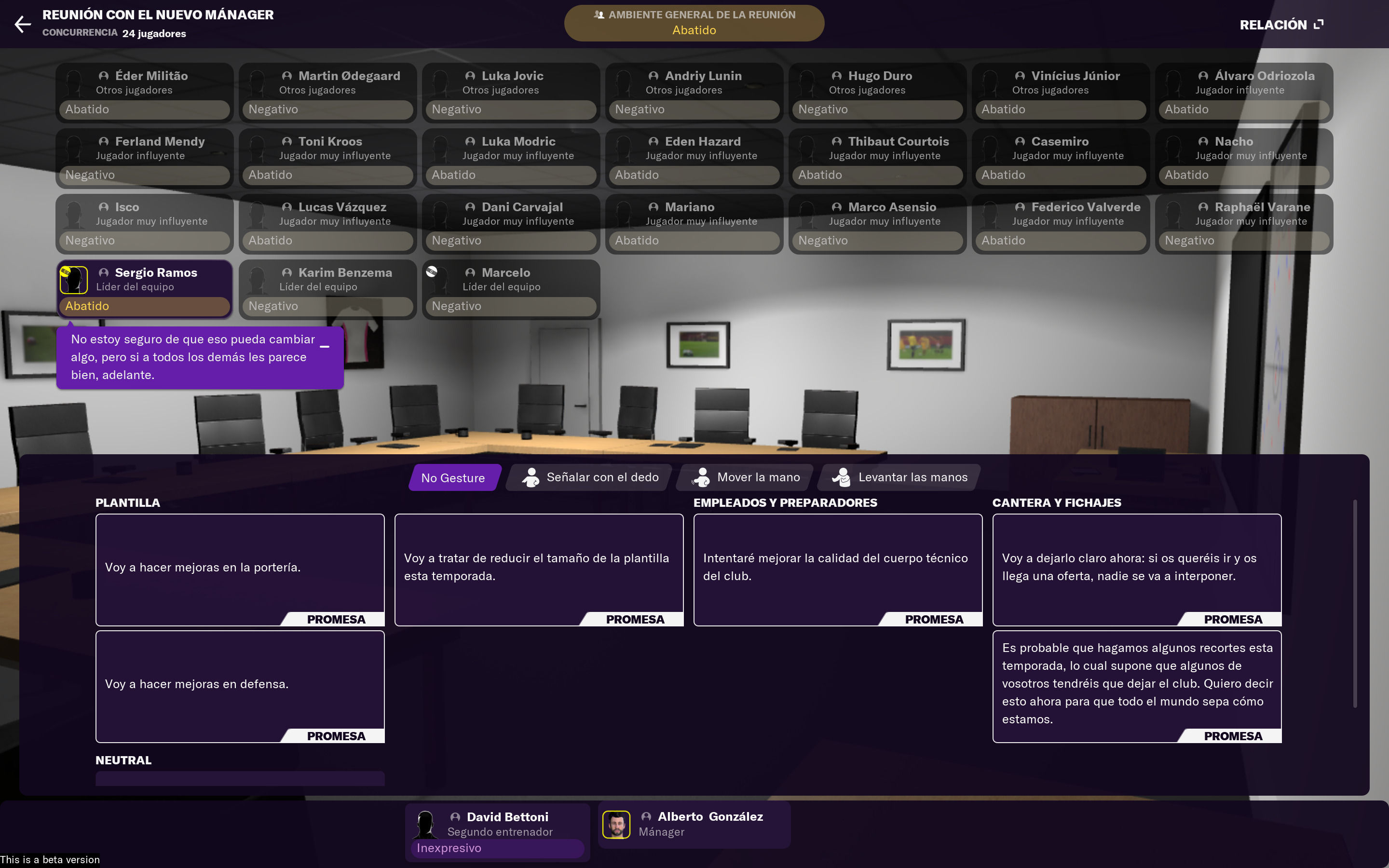 La manera en la que nos comunicamos con nuestros jugadores, con los medios de comunicación, con el presidente de nuestro club o incluso con los miembros del staff técnico es radicalmente diferente. Todo es más realista y creíble gracias a los llamados gestos, una opción interesante y muy bien traída, que nos permite amplificar, enfatizar y reducir el impacto de nuestras palabras y comentarios. El contexto que crea la incorporación de una especie de emoji con nuestra figura haciendo gestos -señalar con el dedo, poner las manos en la cadera, subir los brazos, etc- es muy curioso, nos ha encantado. Por primera vez en la saga se nos permite expresar nuestro lenguaje corporal en el juego, generando una idea rolera que permite que todo quede muchísimo más claro, y equiparando la experiencia a lo que sentiríamos si estuviésemos jugando a una especie de aventura conversacional o narrativa con un montón de elecciones a nuestra disposición. ¿Vemos que Sergio Ramos está triste porque no se considera valorado en la plantilla? Nos dirigimos hacia él con una actitud asertiva y positiva, hablamos dándole ánimos y con gestos enfáticos alegres y podemos cambiar su estado anímico de cara al partido y al propio desempeño de su labor en el club. Otra novedad en relación a esto, y que tiene cierta lógica debido a cómo se desarrolla el fútbol moderno y su interacción con los medios de comunicación y a nivel interno, son los chats rápidos, unas conversaciones breves e informales sobre una variedad de temas que no requieren una reunión completa.