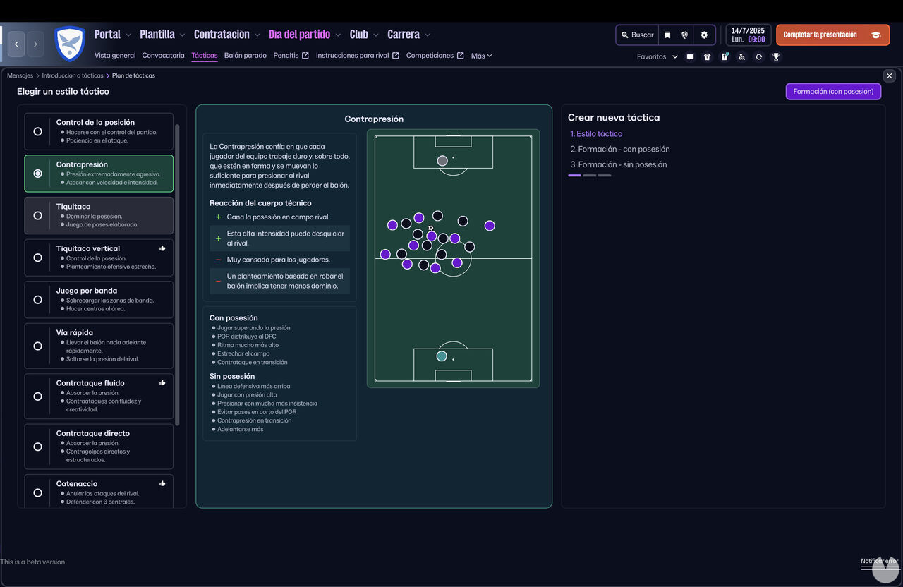En este ámbito, hay que destacar que el sistema táctico también ha sido revisado. Ahora la gestión se divide entre fases 'con posesión' y 'sin posesión', una distinción que aporta profundidad sin caer en el exceso. La IA rival interpreta mejor las circunstancias, ajusta su presión o sus repliegues, y obliga al jugador a pensar como un entrenador de élite, no como un administrador de datos. Esto lleva, de forma directa, a que el factor humano, con aciertos y errores por nuestra cuenta, nos conduzca a un éxito profundo o un fracaso en lo relativo a la aplicación de tácticas y estrategias.