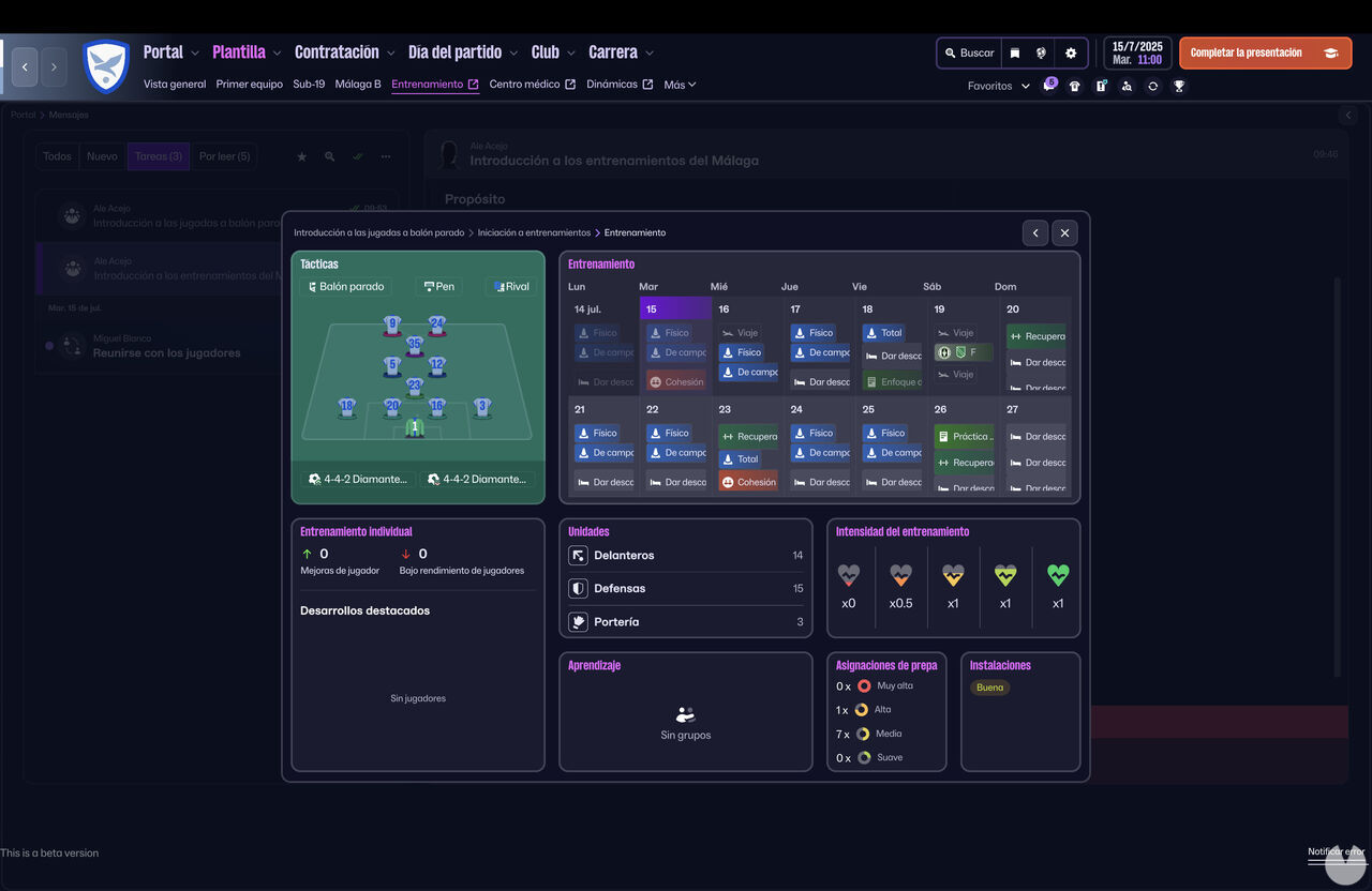 En lugar de sentirte un entrenador, te ves atrapado en una suerte de Excel infinito, un autentico infierno de de datos, que en la gran mayoría de los escenarios no aportan casi nada. Podemos delegar, claro está, y hay muchas fases del entreno y de la preparación física que pueden ser automatizadas. Pero aquí encontramos otro de los problemas más evidentes de esta edición: el ritmo o flujo de la partida no ayuda demasiado. La sensación de avance de FM 26 se ha ralentizado en exceso, o eso nos ha parecido en nuestra partida, con multitud de peajes antes y después de los partidos, que acaban por lastrar el desarrollo de la temporada.