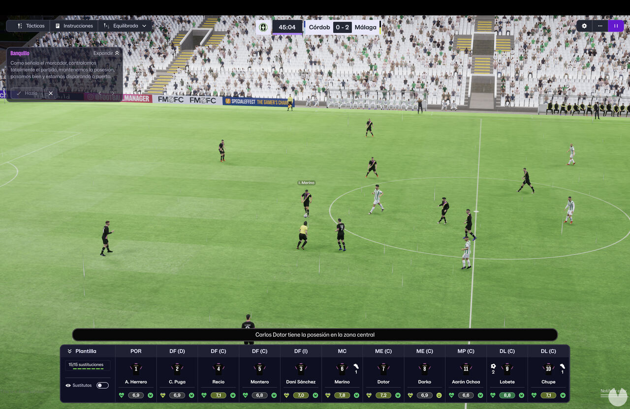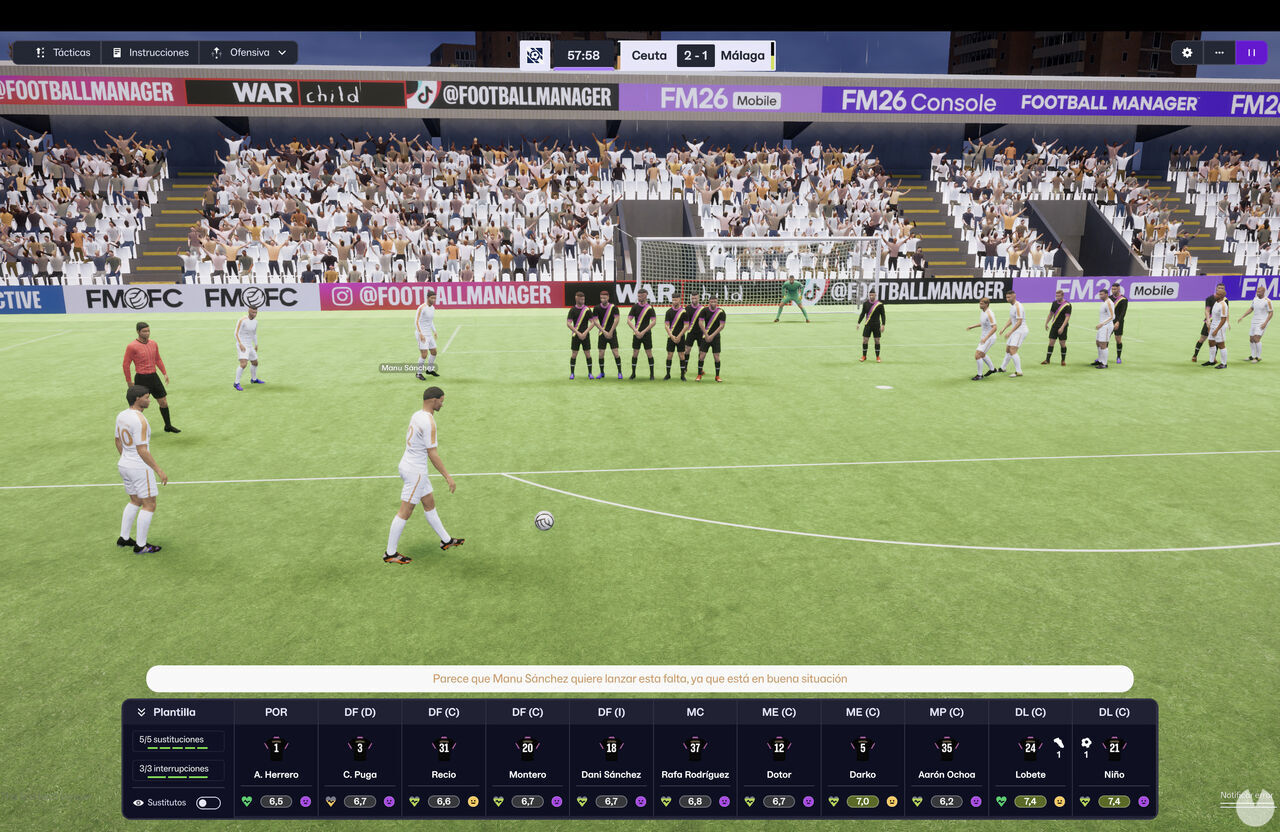 Pero donde el salto técnico brilla de verdad es en el día del partido: las animaciones de los jugadores, los movimientos sin balón y el comportamiento táctico in situ han ganado una naturalidad inédita en la saga. Football Manager se acerca visualmente a la televisión. Hay buenos ángulos de cámara, el público luce mejor que nunca -con recreaciones en 3D y animaciones creíbles-, e incluso con estadios que, por fin, se parecen bastante a sus homólogos reales. La física no se queda atrás: ahora es muy disfrutaba el ver un partido como entrenadores, con desmarques, disputas y choques contundentes, un balón que se comporta de verdad como una pelota -y no como un trozo de papel o una piedra que hace lo que quiere-, y equipos que pasan de la defensa al ataque con credibilidad.