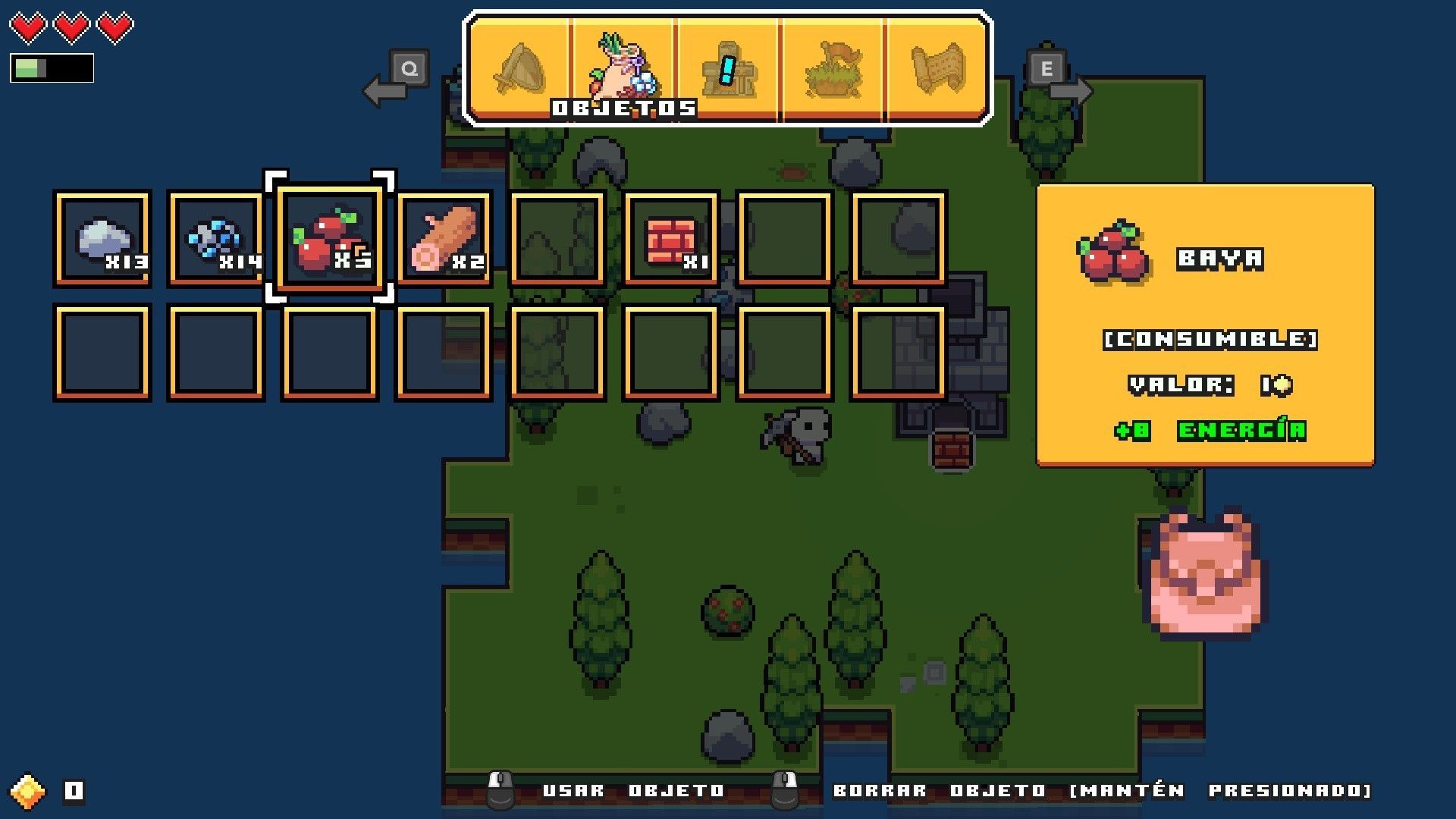 Además del sistema típico de artesanía o crafting hay otras mecánicas, como un ciclo de noche y día, un inventario limitado –ampliable con mochilas-, enemigos –el combate es bastante simple, pero el juego no pide más- y un sistema de alimentación, pues con el esfuerzo se agota una barra de alimento que será necesario reponer con frutos o, por ejemplo, peces cazados con una trampa.