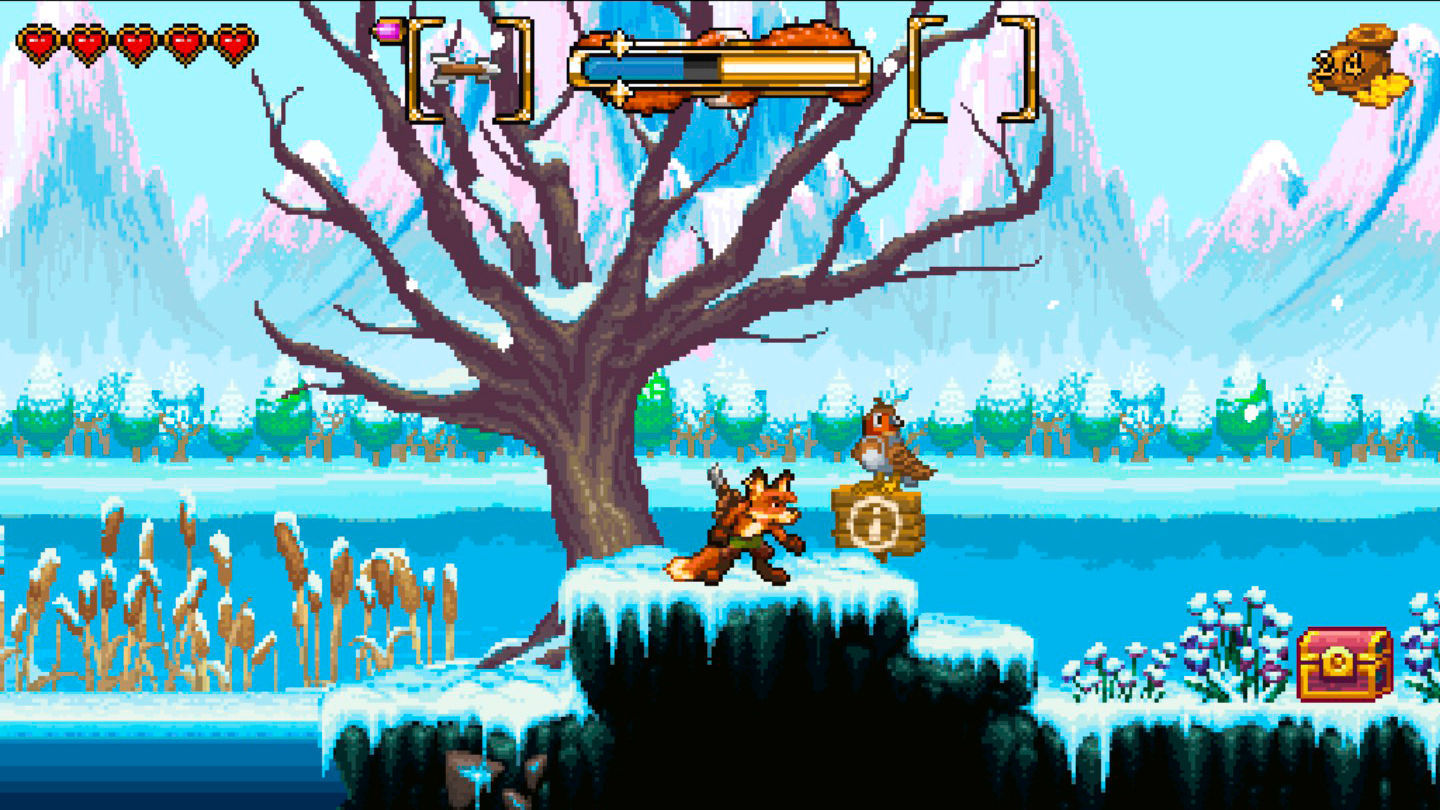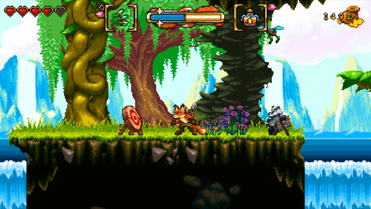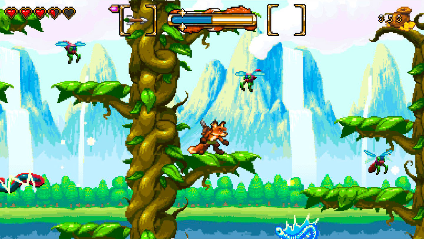 Nuestro protagonista es Rick the Fox, un zorro armado con una ballesta que lleva incorporada una bayoneta. Con esto tenemos ya definido el método de ataque: disparos de flechas para largas distancias y cortes durante los saltos o a ras de suelo. Como hemos mencionado, la acción aunque siempre presente para derrotar a enemigos del camino, el ritmo pausado impide que hablemos de un run and gun completamente arcade. Las plataformas son la base de su jugabilidad.