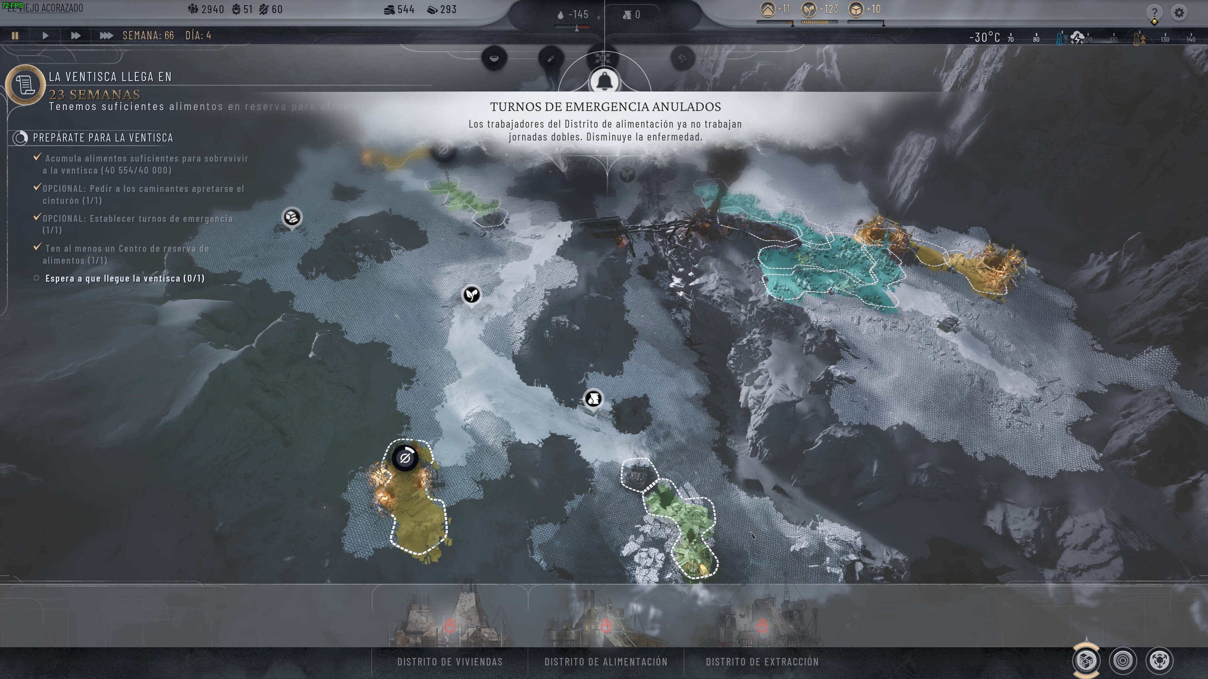 Uno de los mayores saltos que vais a notar en Frostpunk 2 si jugasteis a la primera entrega es la escala que es mucho mayor, de hecho, la ciudad más grande que podíamos construir en Frostpunk es, básicamente, el "núcleo" inicial de la de Frostpunk 2. Ahora ya no construiremos casas o pequeños edificios de forma independiente sino que en su lugar daremos forma a distritos para distribuir la población y las diversas zonas de la ciudad. Por supuesto tendremos distritos residenciales, de extracción para obtener recursos, industriales para transformar materiales en objetos o útiles necesarios para sobrevivir, alimentación para obtener comida para los habitantes de la ciudad y logísticos que servirán como centro de operaciones para nuestras unidades de exploración.