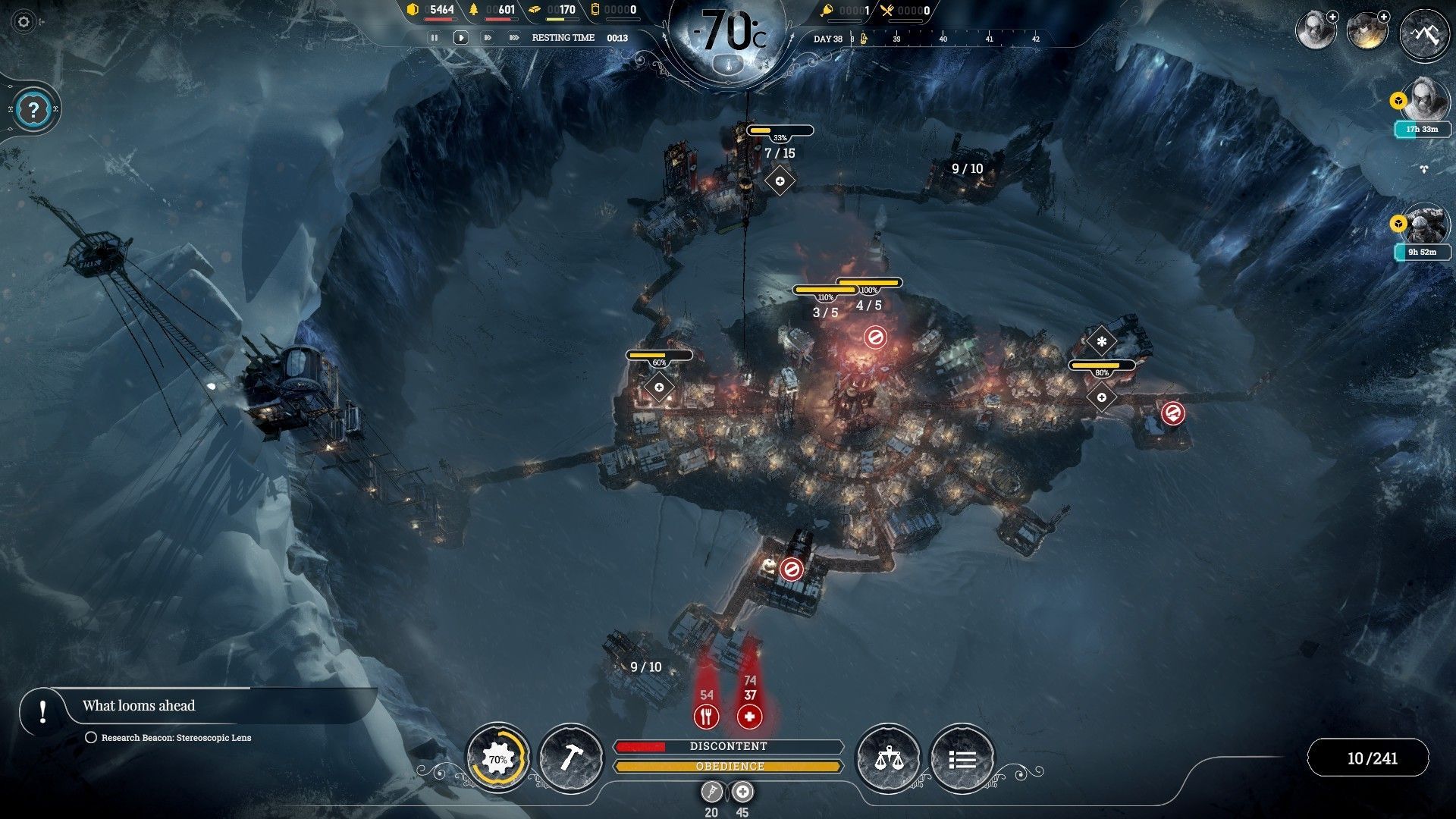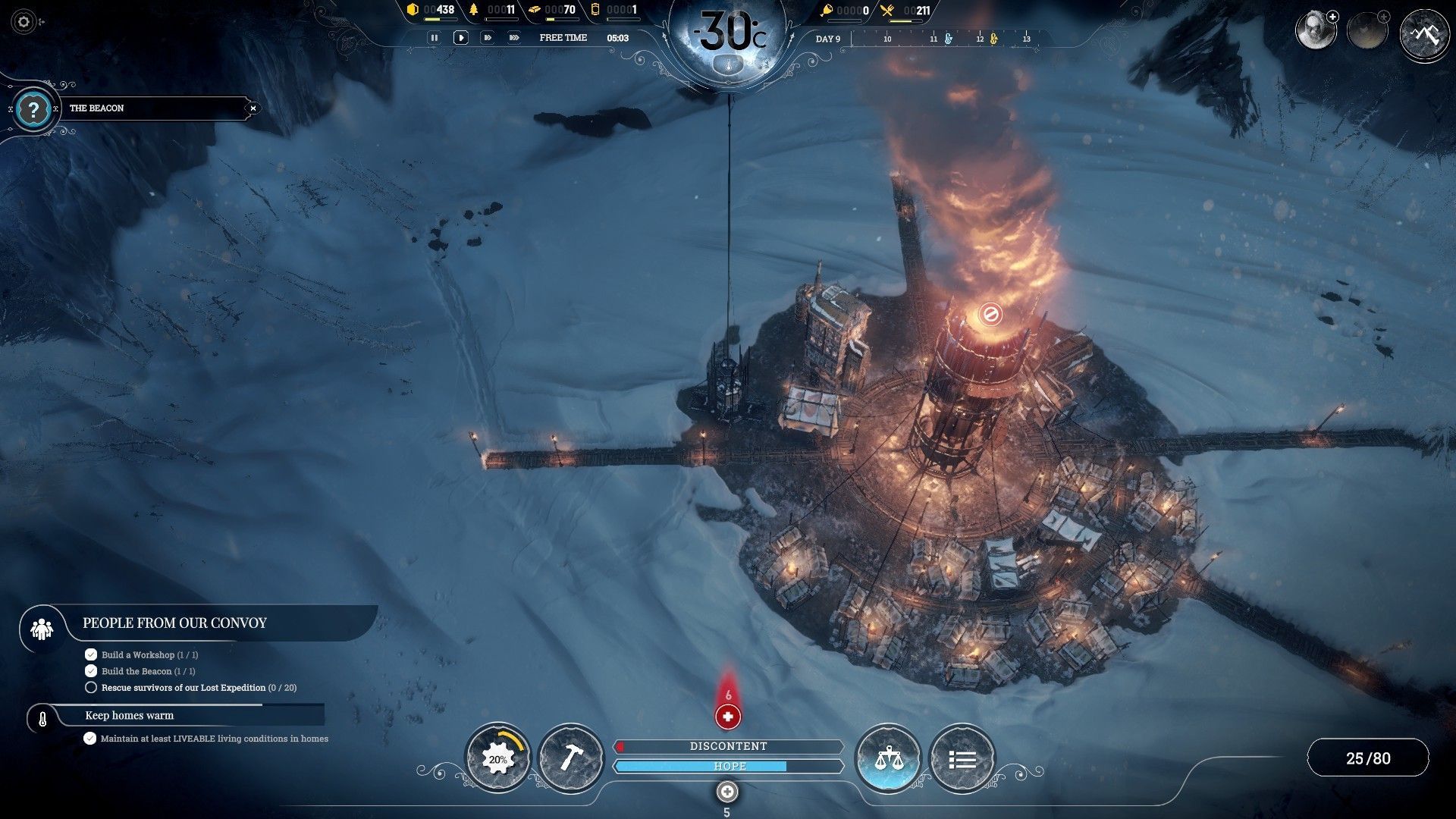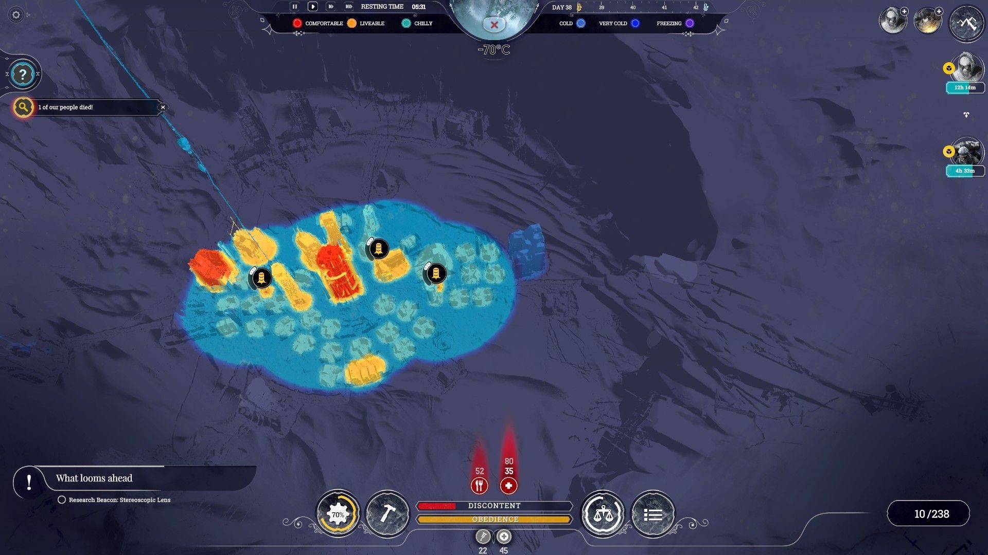 A medida que pasan los días en el juego, el clima se irá haciendo cada vez más duro, rebasando incluso los 70 grados bajo cero y haciendo que la vida sea prácticamente imposible para todos los habitantes de nuestra ciudad que, con estas temperaturas, caerán enfermos con facilidad y podrán llegar a morir mermando nuestra población y, con ello, también la mano de obra esencial para obtener todos los recursos que necesitamos para sobrevivir.