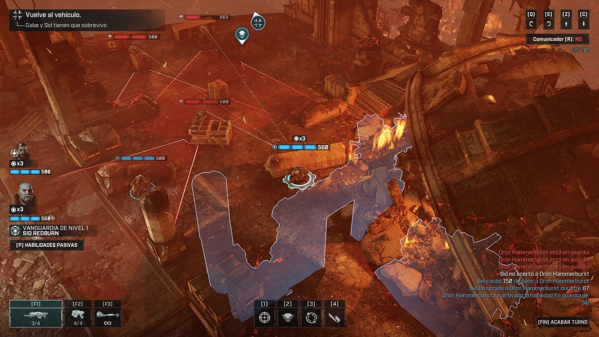 La base, como podéis imaginar, es la misma que en cualquier juego de este estilo. En nuestro turno tenemos que gestionar todo lo que hacen nuestras tropas, con cada unidad teniendo un número máximo de acciones por turno que podemos gastar como nos dé la real gana, ya sea moviéndonos, cubriendo una zona, recargando el arma, utilizando nuestras habilidades… En Gears Tactics no hay un orden específico para realizar las acciones, así que tenemos libertad total para, por ejemplo, disparar y después movernos o ejecutar cualquier acción o habilidad en el orden que queramos, e incluso intercalar las acciones de las distintas unidades a nuestro gusto sin limitación alguna, lo que nos da mucha libertad y riqueza a la hora de amoldarnos a las distintas situaciones que se dan dentro de nuestros propios turnos durante la partida.