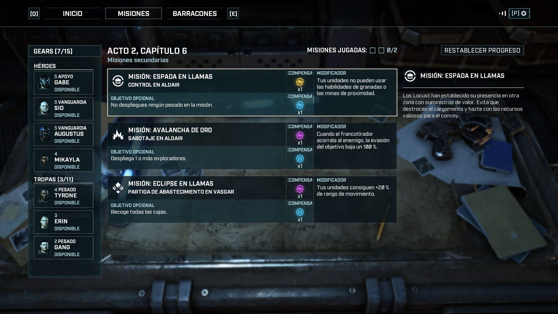 Además, esto empeora debido a una mecánica desafortunada, que no es otra que la de, en ciertos puntos de la partida, obligarnos a hacer misiones secundarias para avanzar hacia el siguiente capítulo. Para intentar añadir variedad se nos ofrecen, por ejemplo, cuatro secundarias diferentes y se nos obliga a escoger entre dos de ellas para avanzar… teniendo el problema de que las secundarias vuelven a apostar, con ciertas variantes, por las mismas clases de misiones que en la campaña principal. Se trata de una forma demasiado artificial de alargar las horas de juego que lastra de nuevo todas las bondades de este Gears.