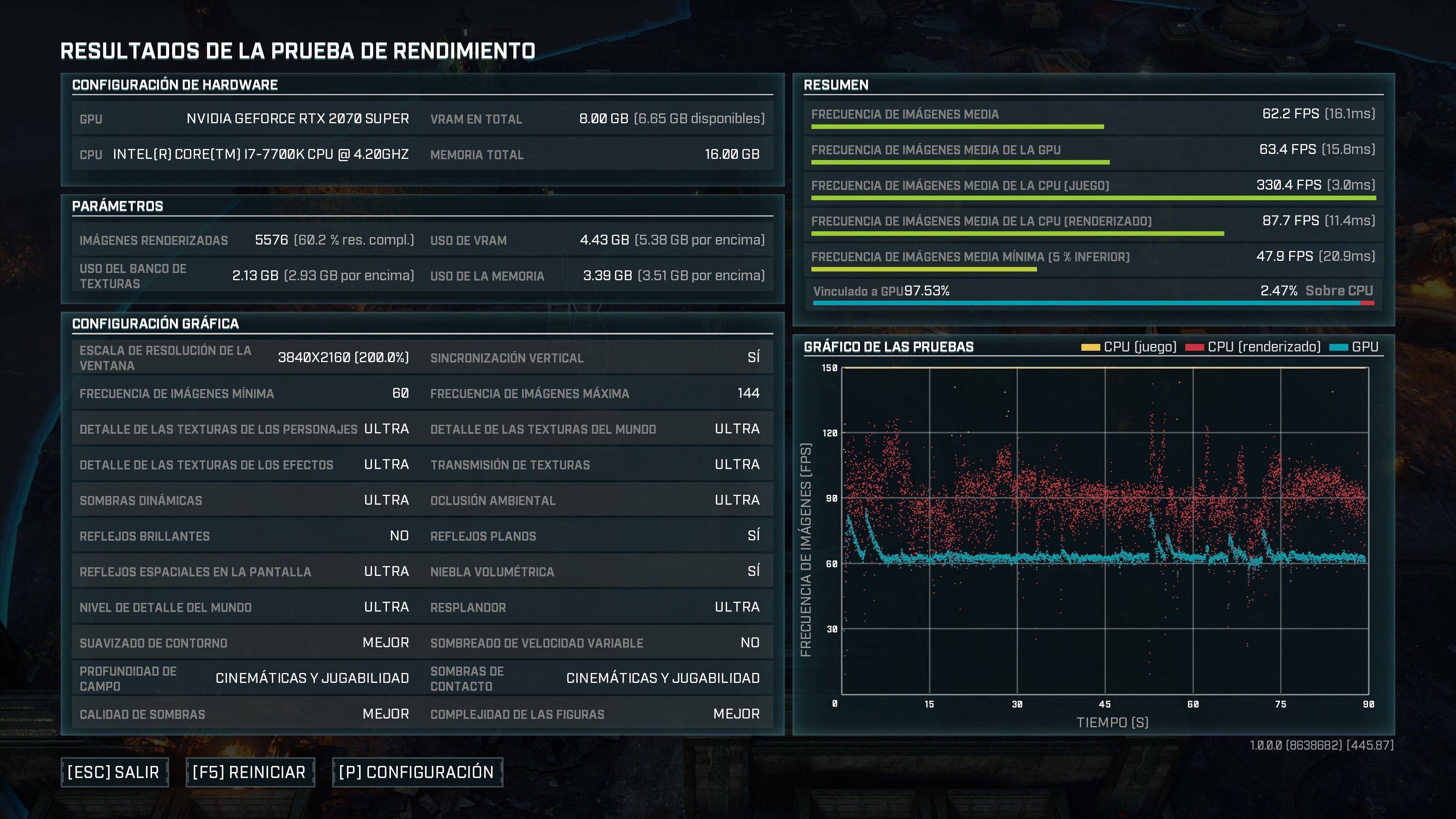 Más allá del problema de la carga de texturas y de que algunas de ellas no parecían corresponder al acabado general del título, no hemos tenido problemas a nivel técnico y de hecho el título está tan pulido que podemos jugar sin problemas en Ultra y a 4K a 60 fps o, si lo preferimos, a 1080p y a más de 144 fps con nuestra gráfica NVIDIA GeForce RTX 2070 Super, Procesador Intel Core i7 7700K, 16 GB de memoria RAM DDR4, unidad de almacenamiento SSD y Windows 10 en su última versión.