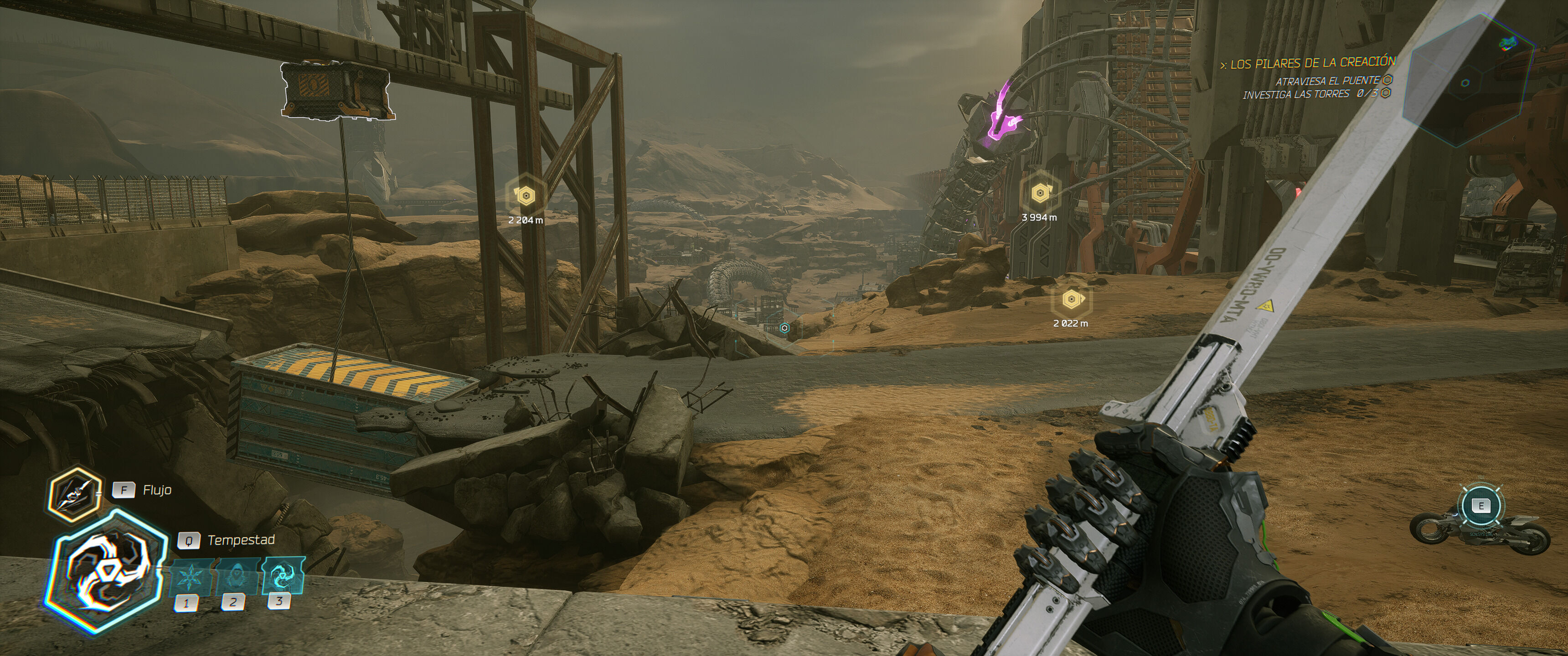 Sin embargo, aunque el juego comienza y concluye fantásticamente, hay una sección central donde el ritmo se resiente mucho, y tiene que ver con lo que mencionamos antes de la ambición. Una de las principales novedades de Ghostrunner 2 es la moto, que aunque podría controlarse mejor, ofrece varias secuencias de ensayo y error frenéticas en las que debemos esquivar obstáculos a toda velocidad, realizar saltos de infarto e incluso enfrentarnos a enemigos sobre ruedas. Pero también es la protagonista de una extensa fase no lineal de mundo abierto donde el plataformeo y los combates están más diluidos, y donde hasta el propio entorno es menos atractivo que en el resto de la partida, pues de los rascacielos repletos de colores vibrantes pasamos a un páramo postapocalíptico sin personalidad.