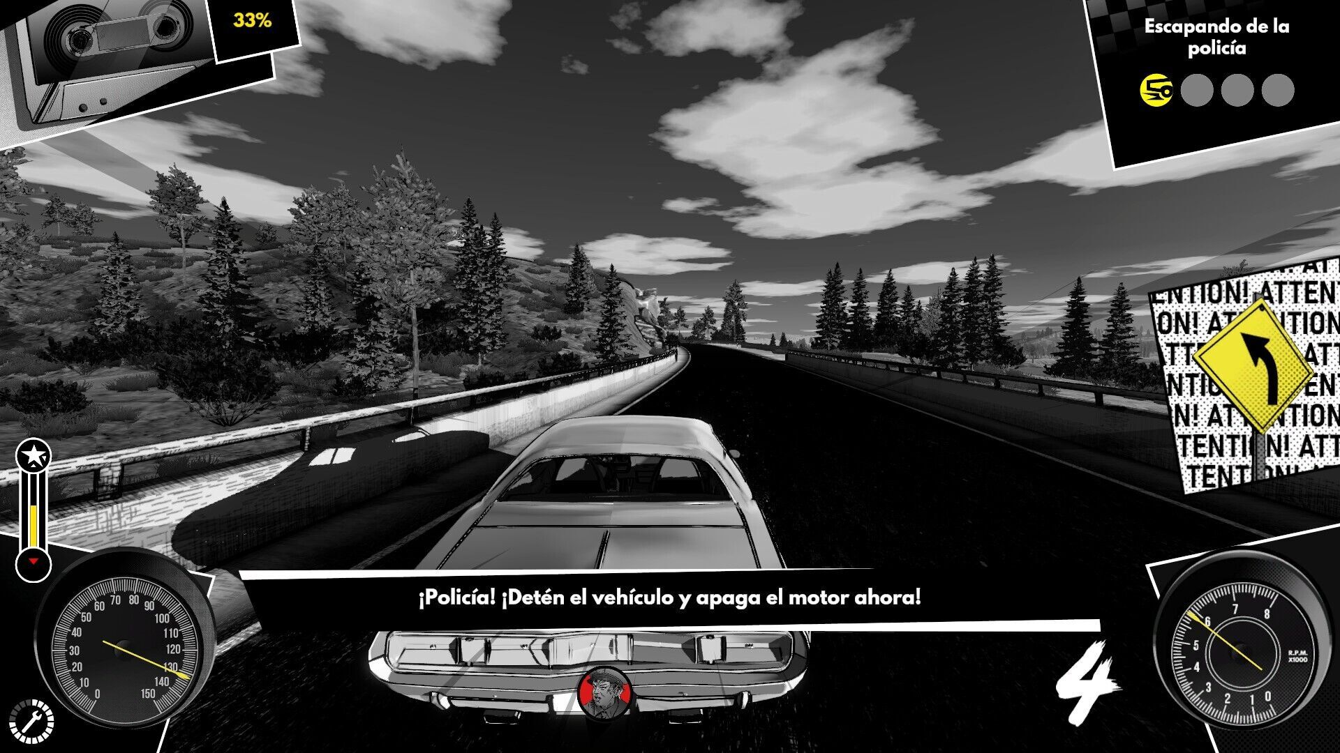 Heading Out simula un cómic en blanco y negro, o casi. Sólo algunas notas de color para hacer el gameplay más cómodo, caso de las señales o las luces de la policía, rompen la estética con sombras duras y tramas que dan textura a la imagen. Como la parte narrativa y las carreras respetan esta misma dirección artística, se mantiene la coherencia y no se siente que son dos juegos diferentes dentro de uno. Por poner alguna pega, ya técnicamente es bastante simplón, nos ha molestado un poco la aparición súbita de vegetación.