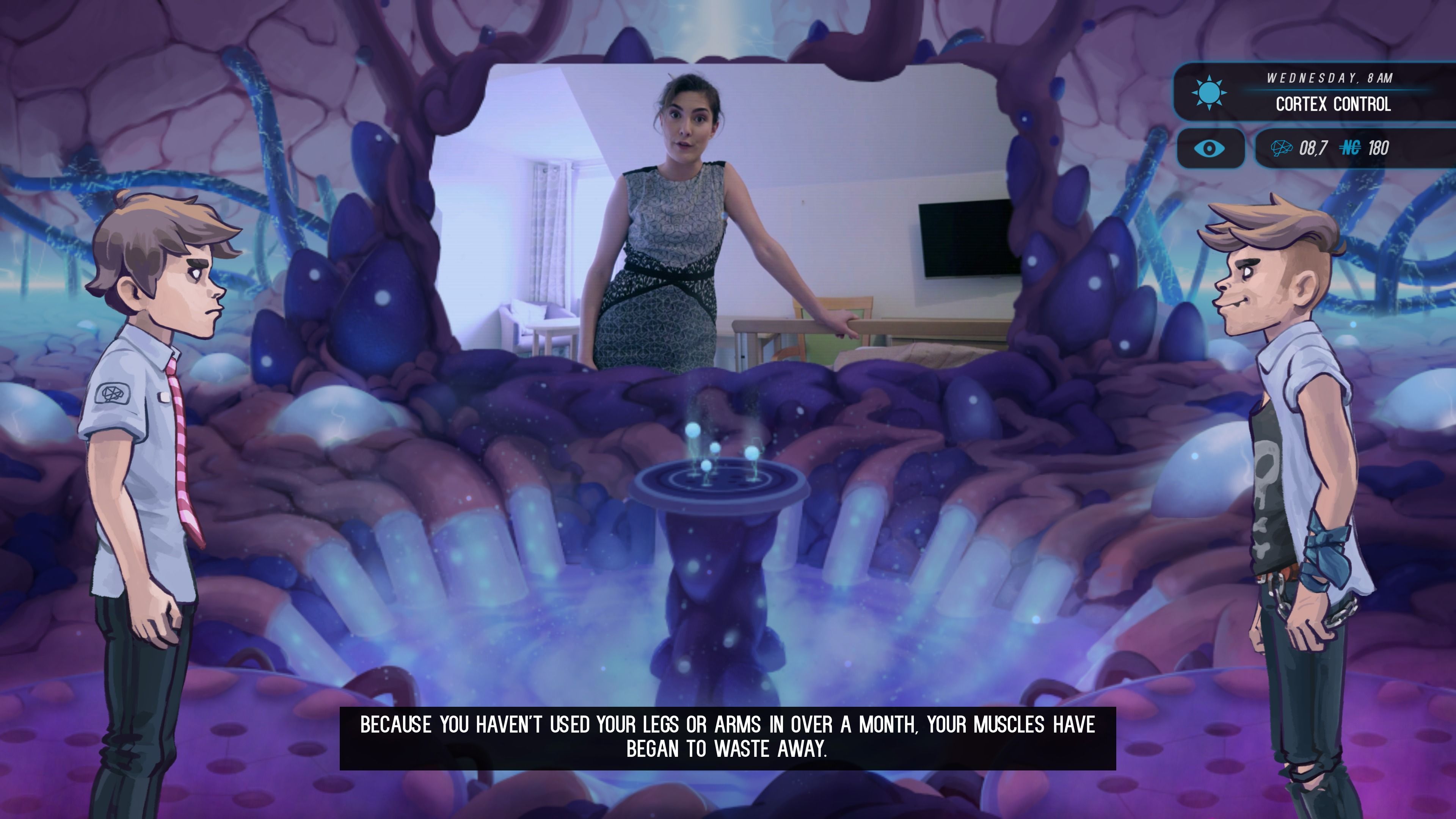 Para descubrir qué ha pasado tenemos que reparar el cerebro desde dentro, y sólo podemos hacer una cantidad de cosas determinadas cada día. Mientras Theo está despierto tendremos que realizar ciertas tareas. Por una parte, tendremos que hablar con la gente que viene a visitarnos –la doctora, un amigo, un detective...–, y por otra parte podemos hacer una serie de pruebas para ayudar a recuperar nuestro cerebro, y ganar de paso los puntos necesarios para arreglar departamentos y contratar neuroempleados.