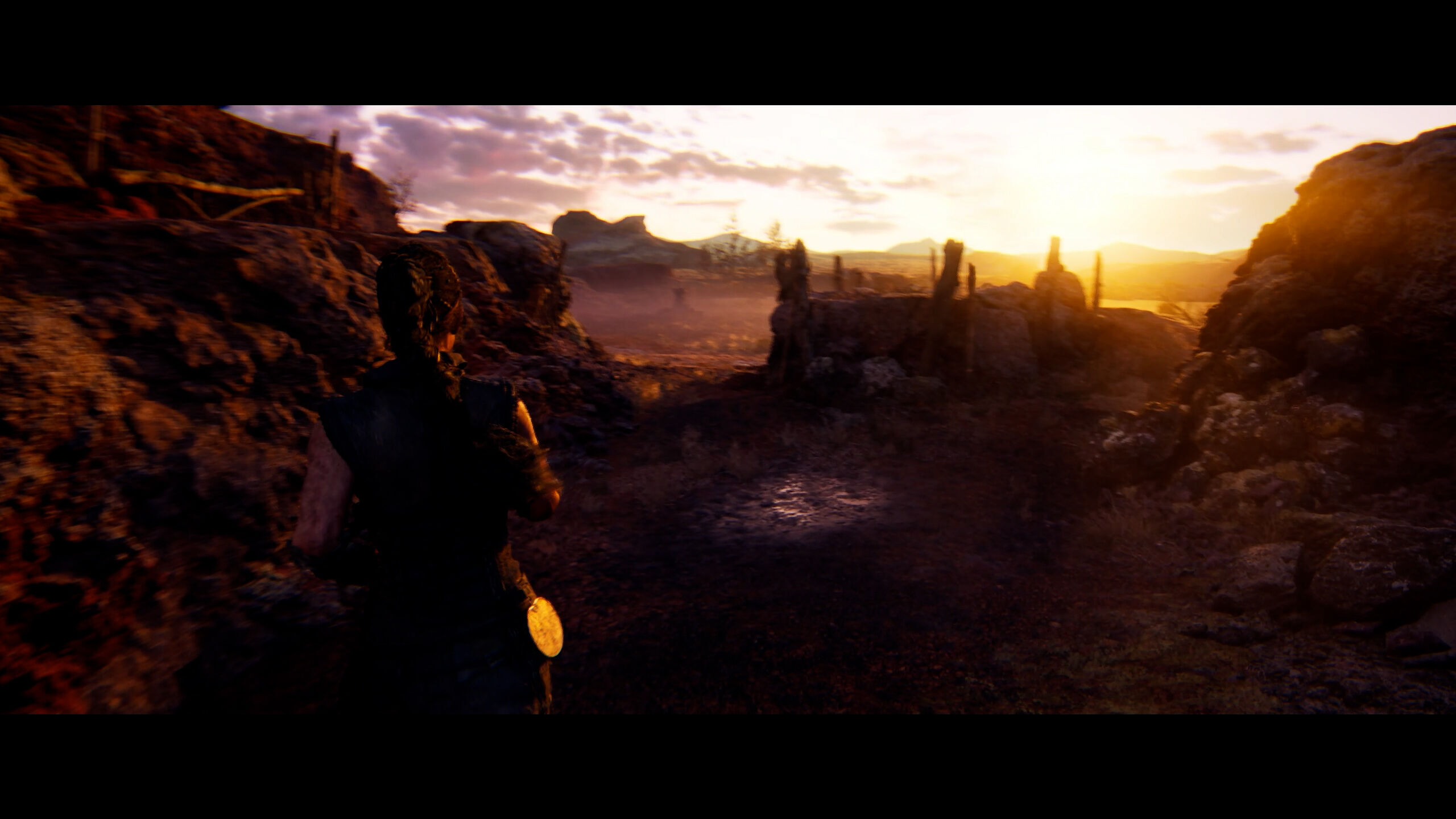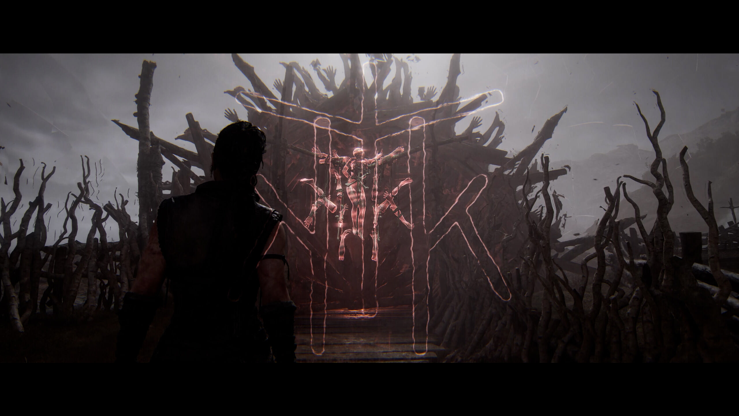 Todo este espectáculo tiene un coste que, una vez con el mando en las manos, no afecta tanto como se pudiera pensar. Ya ocurrió con Resident Evil 4, The Evil Within y The Order: 1886, entre otros. Hellblade 2 se juega con bandas negras incluso en la versión para PC a no ser que se tenga un monitor ultrapanorámico. Es un juego exigente en lo técnico, que funciona en Xbox Series X/S a 30 FPS, y cuyos ajustes en PC son una maravilla: es un título bastante maleable, que nos deja ver tanto en cifras como en la imagen resultante los cambios que estamos haciendo, y que incluye varias tecnologías de reescalado (DLSS, FSR 3, XeSS y TSR propietario) necesarias para alcanzar una experiencia fluida. En nuestro equipo, descrito al final del análisis, jugamos a 1440p con DLSS en modo Calidad a un promedio de 44 FPS.
