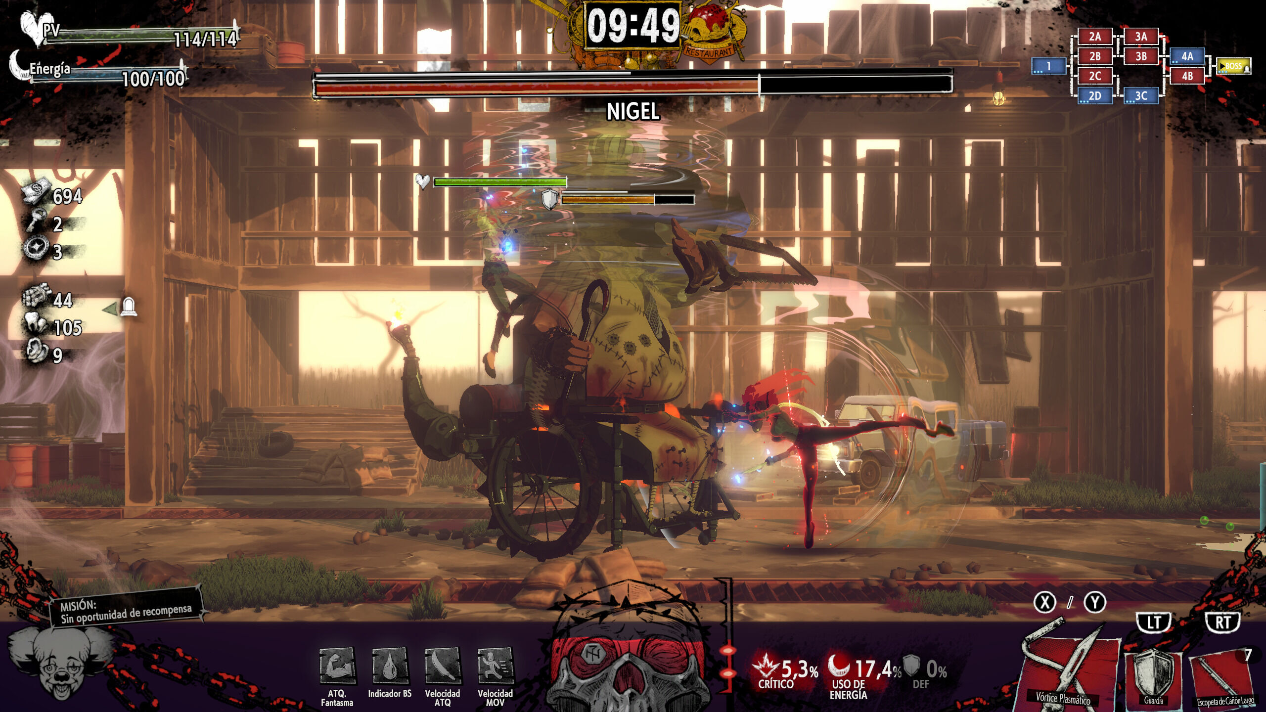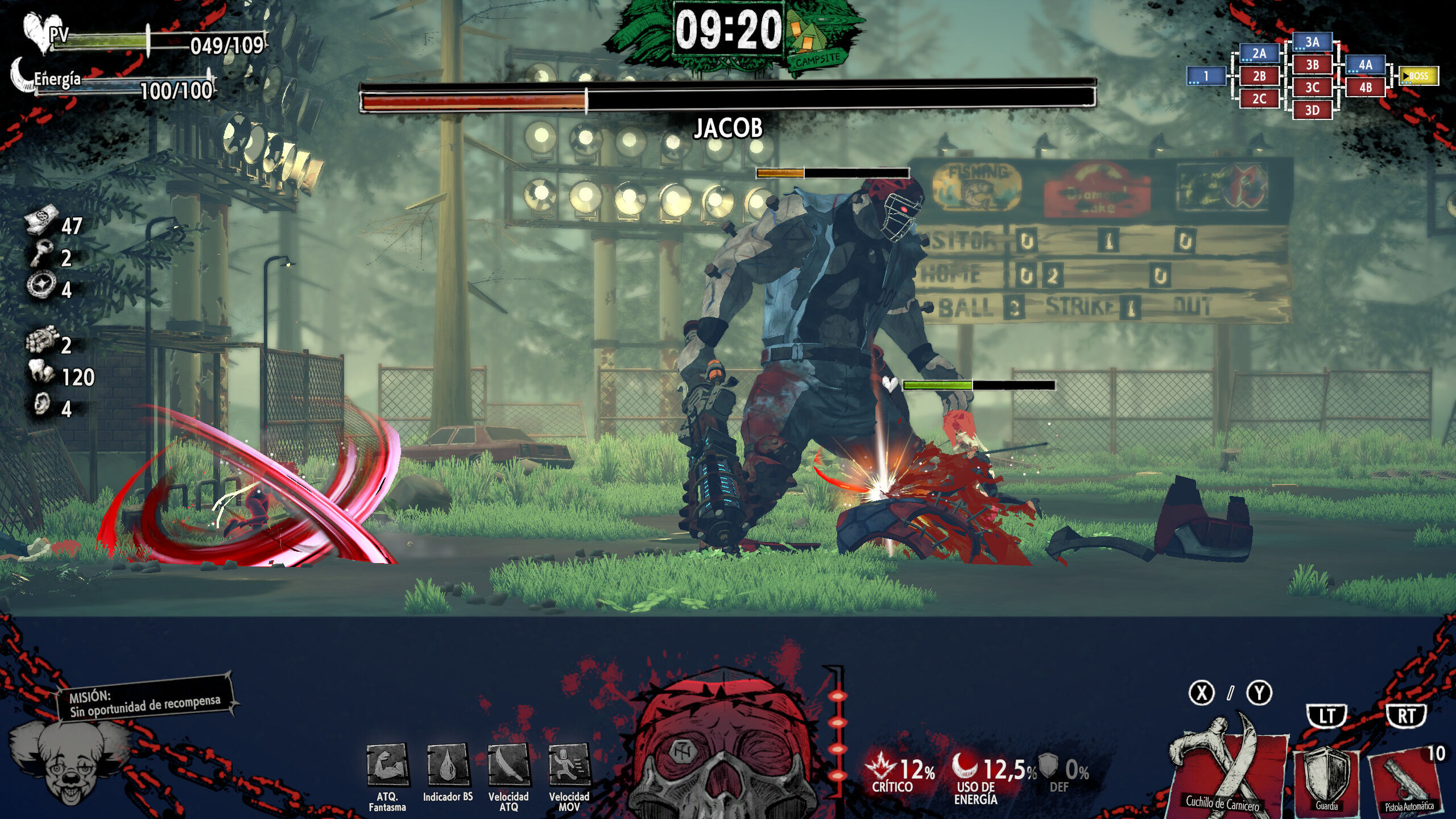 Cuando el indicador de baño de sangre está repleto, podemos gastarlo entero para usar la habilidad especial del Dr. Carnival, que depende del tipo de arma que empuñamos, pero que en cualquier caso es demoledora. Por ello, incluso los jefes más complejos se convierten en un paseo: si conseguimos llegar al boss dos veces ejecutando el poder del asesino en serie, nos bastará con darle unos pocos golpes en la tercera vuelta para derrotarlo. Incluso en el modo difícil nos hemos encontrado con esta situación que echa por tierra estos grandes combates, que son lo mejor del juego y que podrían ser fantásticos si no fuera tan fácil romperlos.