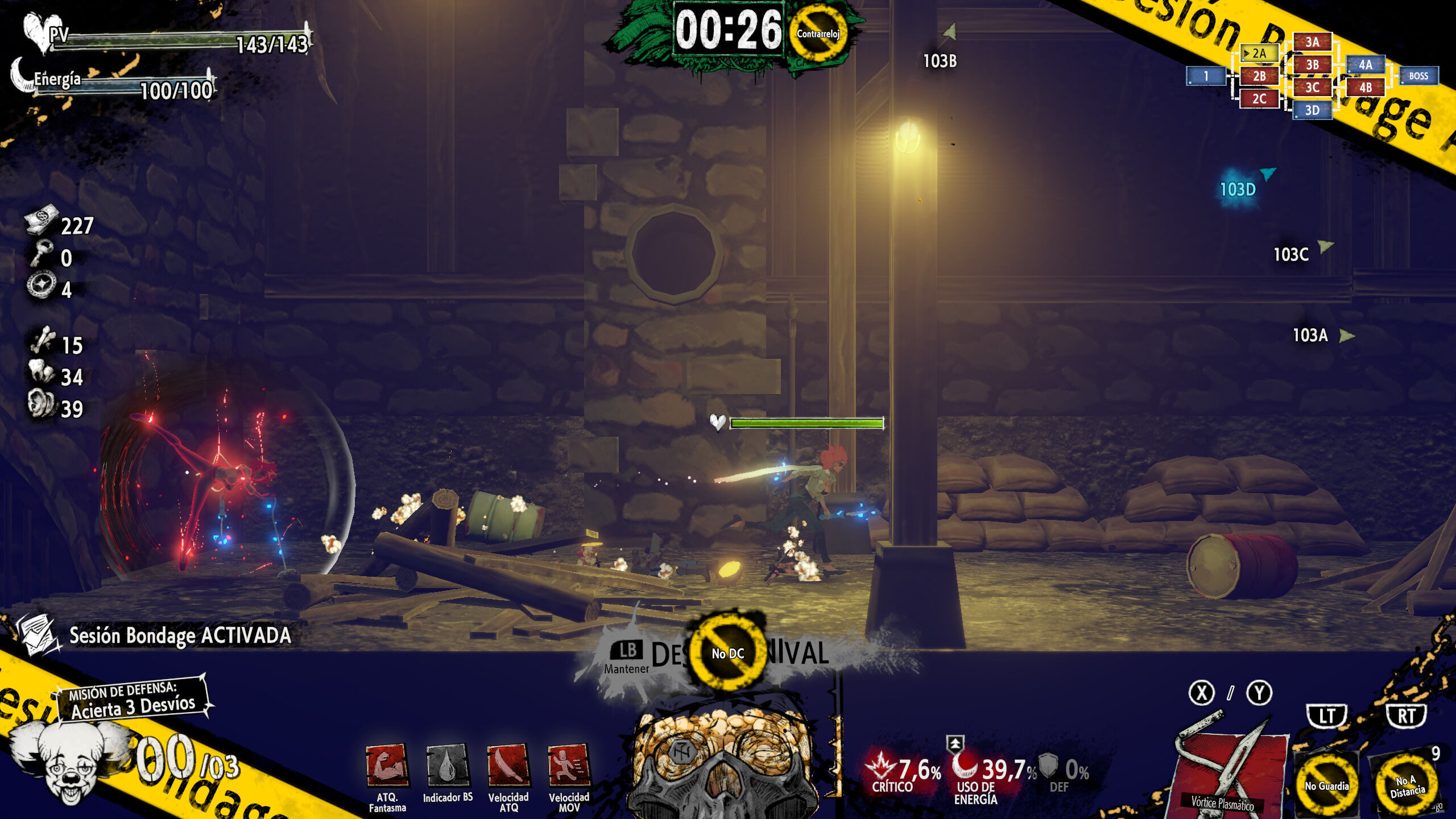 De hecho, probarlo nos hizo percatarnos de un error que representa bien la desconexión en el diseño. El modo bondage propone superar una fase con ciertas restricciones para desbloquear trajes, armas y recursos. Antes de comenzar el modo Nueva Partida+, tratamos de completar una de las fases sin poder recibir un solo golpe. Al empezar el New Game+, la restricción permanecía activada, sin la posibilidad de desactivarla porque en esa nueva partida aún no habíamos conocido al personaje que permite acceder al modo Bondage.