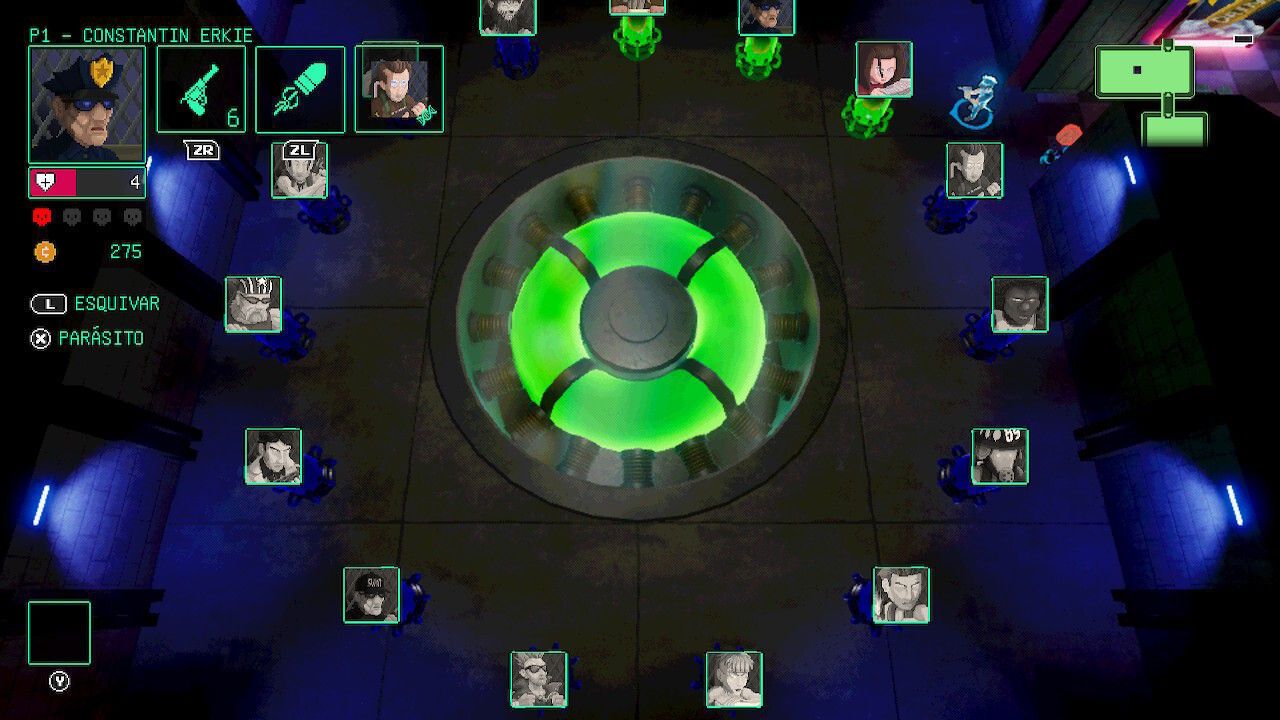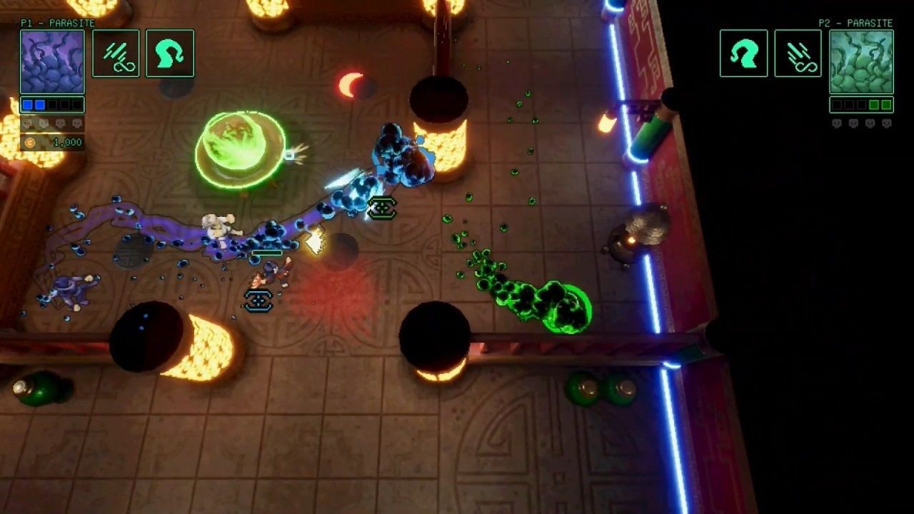 La disposición jugable que pone sobre la mesa este título es la de un roguelite de concepción twin stick shooter. A lo largo de escenarios más bien simples que, básicamente, se componen de estancias de diseño rectangular, tenemos que ir acabando con los pobres humanos (más los jefes finales correspondientes) que tratan de acabar con la invasión alienígena… es decir, con nuestro parásito extraterrestre. Y para ello y en función de cada tipo con el que nos topamos, sus armas y habilidades para darnos caza varían bastante. Unos personajes que podemos controlar fácilmente gracias a la aptitud estrella del parásito, que no es otra que colarse dentro de sus cuerpos y adquirir así su personalidad… y aptitudes, por supuesto.