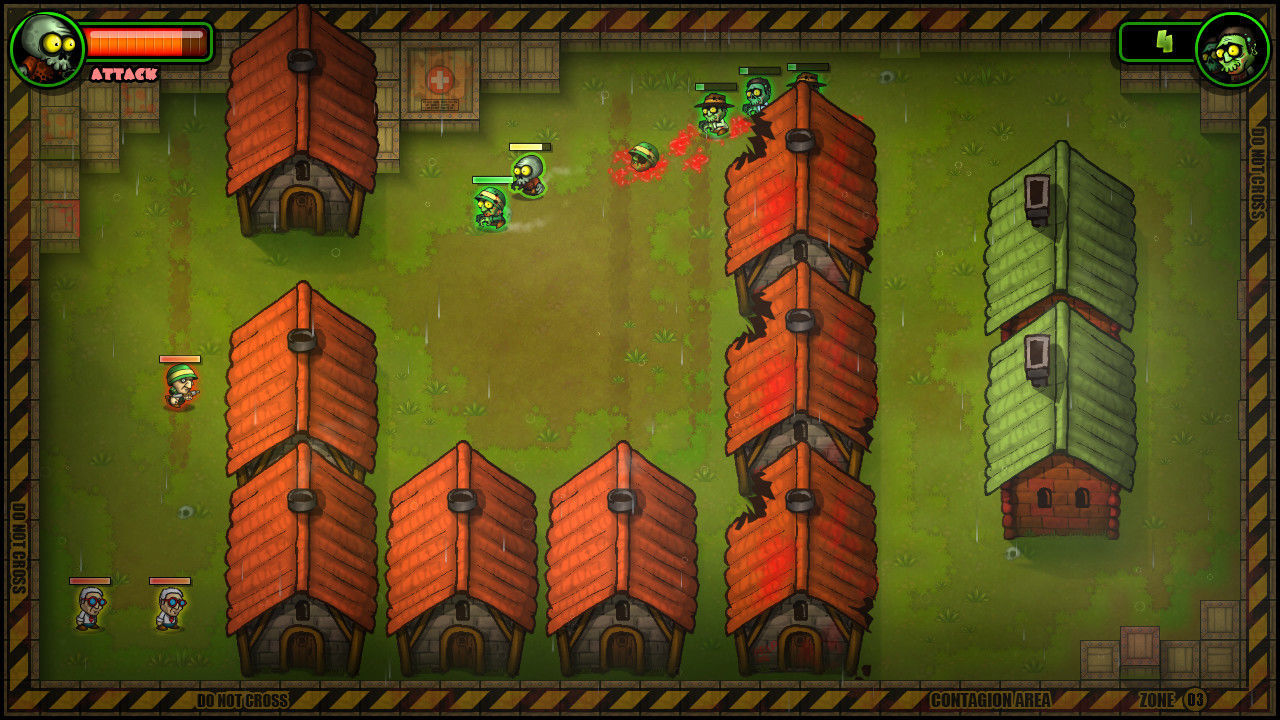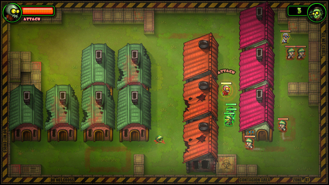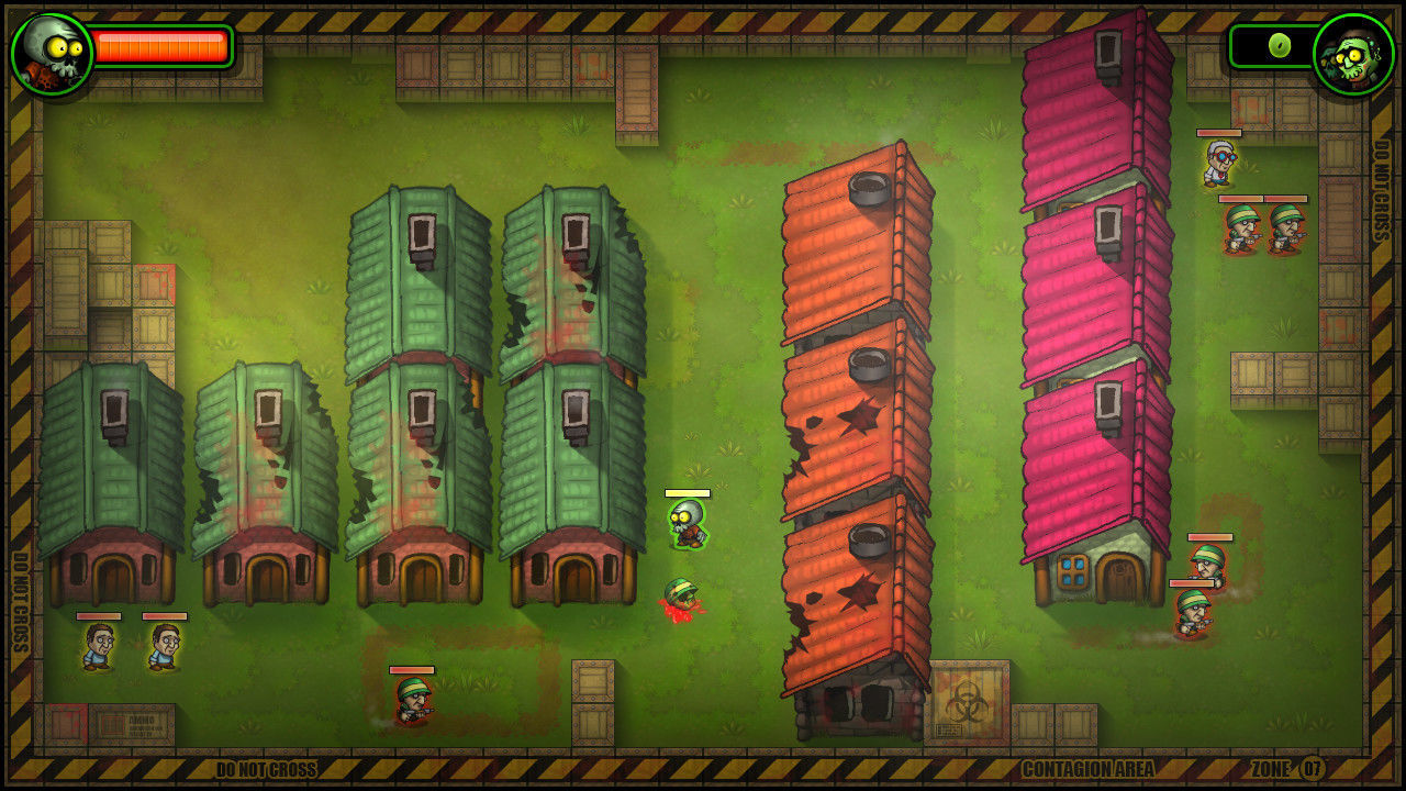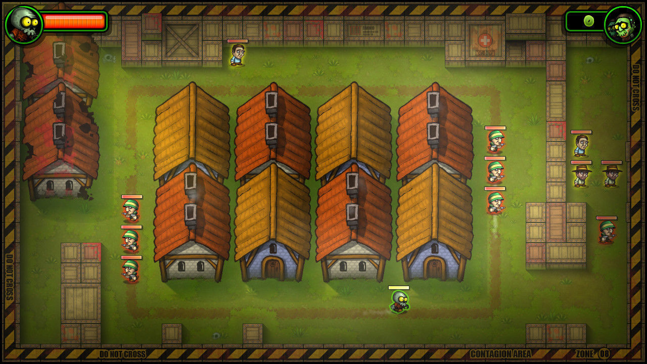 Los escenarios en los que nos movemos son muy sencillos. En esencia, se trata de zonas rectangulares que podemos ver ocupando la pantalla en las que hay múltiples casas y otros obstáculos. Los zombis se identifican rápidamente por su color verdoso en oposición a los humanos. Tanto zombis como humanos tienen una barra de energía que nos permite saber cuánta vida (o vida de no muerto) le queda a cada personaje. Los diseños son simpaticones y se apuesta por el tono desenfadado, pero su simpleza va más allá de una decisión estética y sí se percibe una falta de recursos que permitan dotar de mayor variedad a personajes y entornos. En este sentido, se hace monótono y no cuesta mucho darse cuenta de que una mayor variedad de diseños en escenarios y personajes le habría sentado de maravilla.