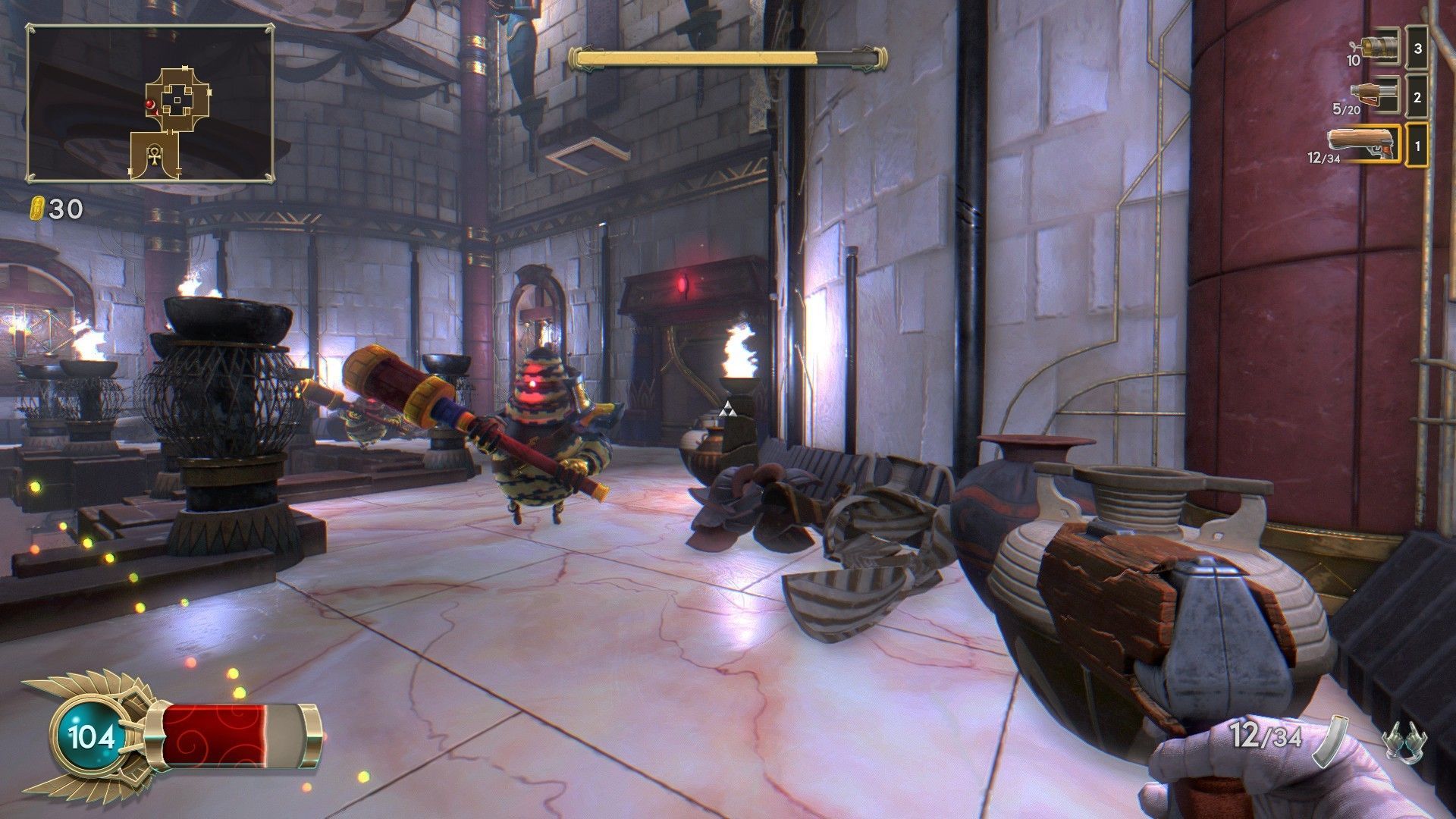 Jugablemente es todo lo que podíamos esperar de un título que se inspira en los clásicos, un poco de Doom, Quake, Serious Sam y Duke Nukem: control preciso y rápido, salpicado de humor chabacano con puñados de enemigos inspirados en la cultura egipcia. Lo más difícil está conseguido. El aspecto que puede definir que se adapte a nuestros gustos o no es otro: el orden aleatorio del mapa, la ordenación de catacumbas y pasillos.