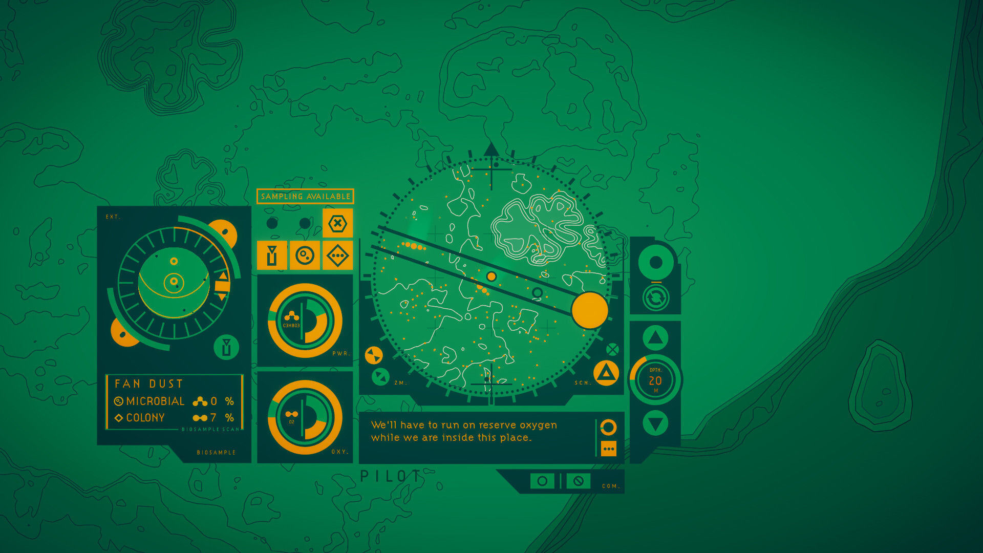 Esas muestras nos servirán para conocer más de esas especies, pero a veces también tienen un propósito jugable. Por ejemplo, en ocasiones nos encontraremos con caminos bloqueados por animales marinos que podremos ahuyentar lanzando sobre ellos una bola de esporas que hayamos recogido anteriormente. El océano de Gliese 677Cc, como el nuestro, está repleto de formas de vida distintas que forman un ecosistema complejo, en ocasiones peligroso, así como de zonas muy diversas: hay lugares en los que avanzaremos sin preocupación alguna, pero hay áreas en las que la toxicidad bajará constantemente nuestro limitado nivel de oxígeno; espacios repletos de hilos de vida que nos darán descargas al pasar entre ellos, disminuyendo la batería que nos mantiene a flote; y cañones en los que la corriente es tan fuerte en la que tendremos que hacer uso de una suerte de turbo que, de nuevo, activamos accionando botones y discos de nuestra interfaz.