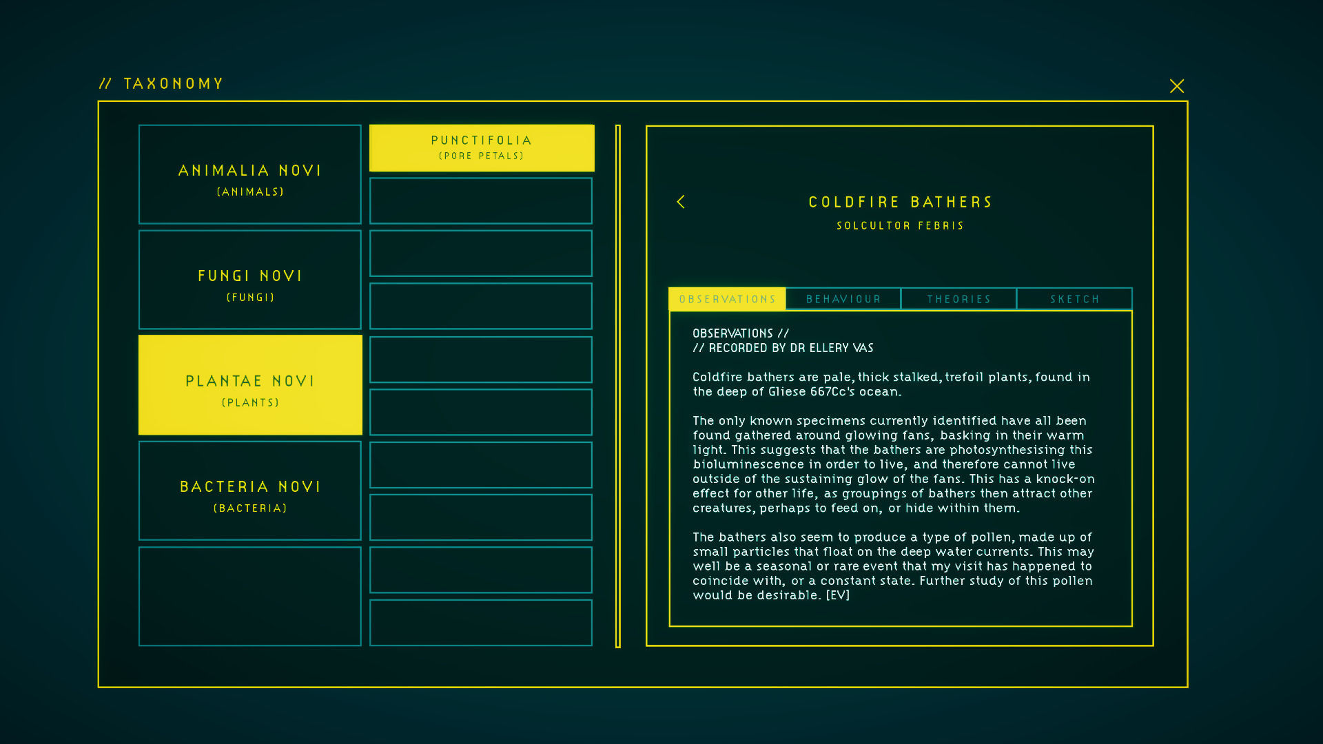 Al principio todo parecía muy denso, pero al final nos hizo clic y nos parábamos a leer sobre todo lo que veíamos para intentar discernir cómo funciona la vida de este planeta. Incluso nos deteníamos en la base, a la que volvemos entre misión, para leer las descripciones de esos seres vivos, que se van ampliando (de la descripción al boceto visual, pasando por la observación y la teoría) conforme analizamos más muestras en el laboratorio.