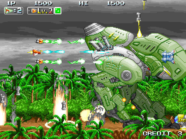 Una vez ya a los mandos, nos encontramos con un inicio frenético (a los viejos del lugar seguramente les recuerde al inicio del arcade Aero Blasters, que también apareció en Turbo Grafx y Mega Drive). Al poco tiempo de derribar enemigos encontraremos un objeto que ya nos deja tener "la versión definitiva de nuestra nave", ya que entonces nos acompañarán dos satélites, llamados bits, que podemos mover hacia los lados o hacia delante, lo que sirve para hacer un poco de protección respecto a misiles, ampliar la zona de daño, o concentrarla para un mayor efecto.