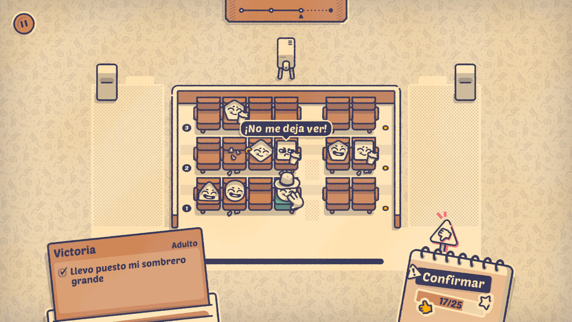 Y no lo es por una sencilla razón: a medida que transcurren los niveles las cosas se van complicando cada vez más. La tercera fase (que, por cierto, transcurre en la ciudad de Barcelona y demuestra ser autorreferencial, un aspecto en el que reside parte de su peculiar sentido del humor) nos invita a ubicar a los espectadores de una sala de cine en distintas filas (primera, segunda, tercera…), con algunas butacas sucias de palomitas. Ahora, además de volver a toparnos con ese clásico usuario que se ha "olvidado de bañarse" (insistimos en que el sentido del humor es uno de los puntos fuertes del título), tenemos que lidiar con otros que no quieren estar cerca de niños, a los que identificamos por sus rojos pómulos y redondas formas (también veremos un pequeño letrero en el margen inferior izquierdo en el que se explica con lujo de detalles quiénes son y de qué tipo), así como con otros que prefieren disfrutar de la experiencia en solitario mientras comen palomitas.