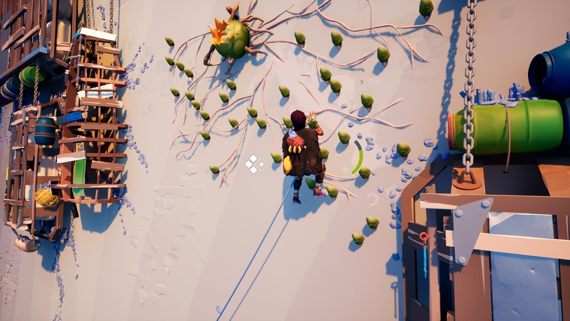 Y aquí entra el plato fuerte: la escalada de Jusant ocupa todo el esquema de controles del juego. Prácticamente no hay un botón del mando que no esté relacionado con una acción de la escalada: los gatillos izquierdo y derecho se usan para asir agarraderas con las manos izquierda y derecha, podemos colocar puntos de agarre dejando pulsado un botón, recoger carrete con otro y subir o bajar por una cuerda con un simple movimiento de joystick. Toda esta gama de acciones -y la forma de representarlas- hace de Jusant un juego físico en el que escalar tiene peso e importancia. Se nos anima a avanzar con parsimonia, pensando en el siguiente paso y deleitándonos en nuestra relación con el entorno.