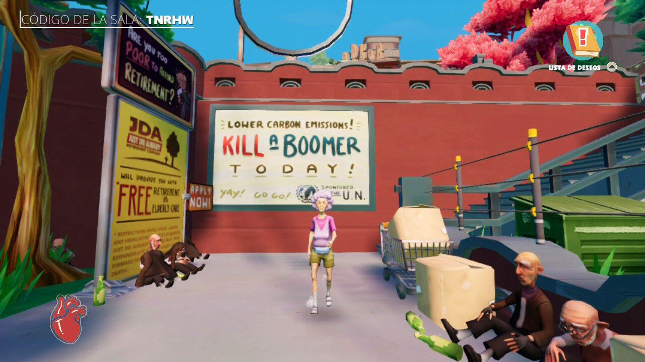 Lo que nos encontraremos en este título es un sandbox grotesco en el que podremos controlar a una persona mayor a elegir entre cuatro personajes, aunque sólo se trata de una decisión estética porque jugablemente no se modifica nada: el mapa de Just Die Already está completamente abierto una vez superamos el tutorial inicial y podemos explorarlo como queramos, interactuando con los objetos, vehículos y personas que nos encontremos por las calles de esta peligrosa ciudad. La gracia de este juego reside en que prácticamente todo lo que hay en el escenario puede matarnos, desde minas antipersona hasta peceras de anguilas eléctricas, aunque los abueletes a los que manejamos son bastante resistentes y pueden seguir caminando incluso aunque haya perdido prácticamente todas sus extremidades.