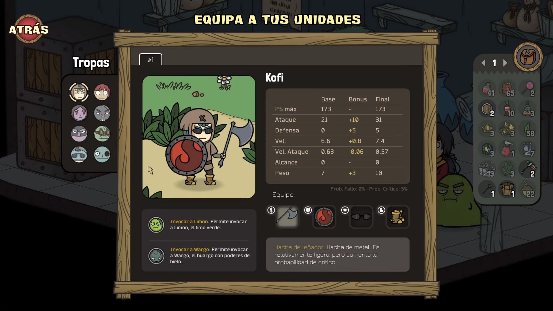 Además de su equipo, Kofi cuenta con la posibilidad de invocar aliados gracias a un cuerno, existiendo un máximo de unidades a poder invocar y un coste asignado a cada invocación. Esta es otra de las habilidades importantes, junto con otras que van apareciendo conforme vayamos derrotando enemigos o la posibilidad de hacer aparecer al huargo o a nuestro amigo Limón (una babosa muy especial), ya que de esa manera podemos decidir la composición de nuestro ejército. Gracias a este sistema podemos centrarnos en usar arqueros, ataques de cuerpo a cuerpo, u otras unidades que aparecerán posteriormente y que darán de más variedad estratégica a nuestras batallas.