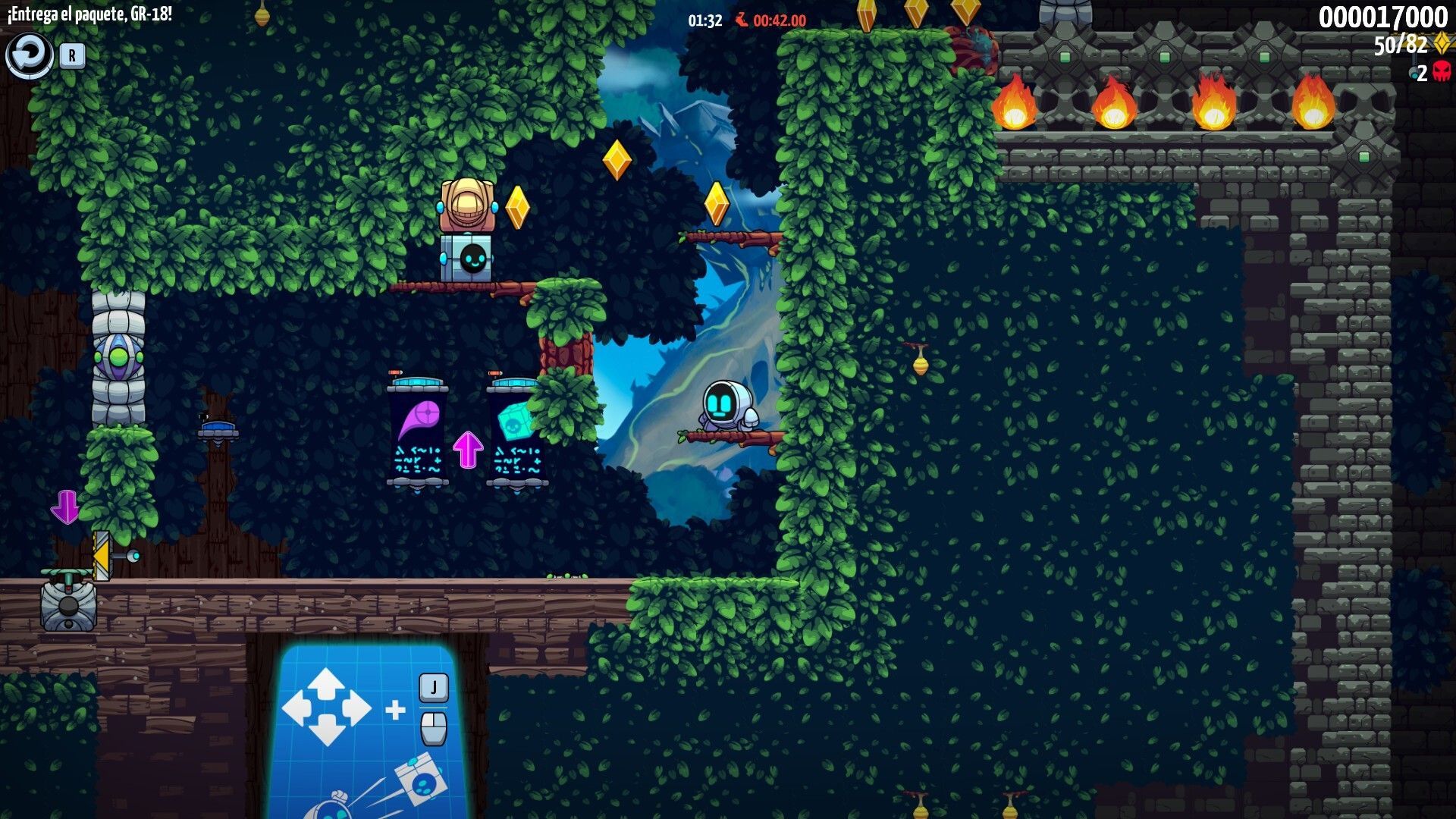 Sí, somos GR-18, un pequeño robot repartidor que debe enviar unas pequeñas cajas a los clientes, que se traduce en avanzar por los niveles, conseguir una caja –que puede estar en cualquier punto de la fase- gracias a nuestro brazo robótico extensible y alcanzar el final de la zona. Hay casi 100 niveles prediseñados, así que incluso tomado como un plataformas indie ya da bastante entretenimiento, con desafíos que van desde los puzles –mover cajas, rebotadores, abrir compuertas- hasta los saltos con precisión de pixel, grandes reflejos y mucha habilidad.