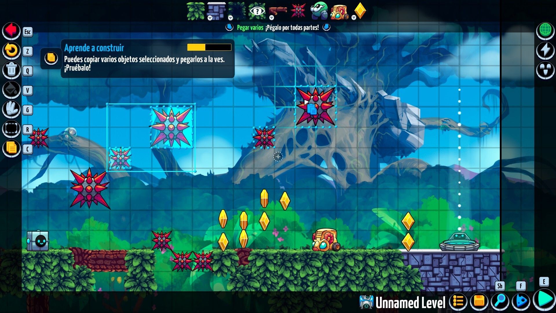 Pero esta historia –que nos llevará aproximadamente 10 horas, aunque seguramente nos dejaremos algunos coleccionables por el camino- es sólo una parte de Levelhead. El verdadero potencial del título es su editor, suficientemente sencillo de aprender para que, al igual que Super Mario Maker, es cuestión de seleccionar bloques, enemigos o compuertas, y colocarlos en un mapa cuadriculado. A medida que jugamos se consiguen nuevos elementos de creación, y con apenas unas opciones se modifica por completo la estética del nivel, su música y el clima, aunque esto nos ha parecido algo corto de variantes. Cierto, no es el editor más profundo que existe –se le escapan algunas funciones que echarás de menos si te lo tomas en serio- ni podrás complicarte la vida con sistemas de lógica o hacer algo para lo que no está previsto, como otros géneros –aunque sí ciertas variantes, tipo juegos de pinball-, pero creemos que hace muy bien aquello que se propone, que no es otra cosa que hacer intuitiva la tarea de diseñar los niveles. Cuestión diferente es que sean divertidos, pero ahí ya entra la inspiración de cada uno.