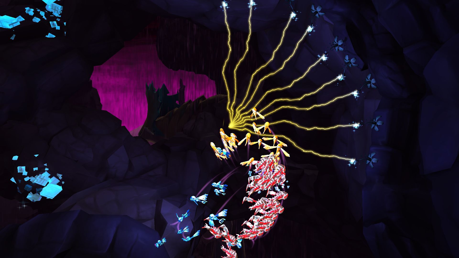 ¿Cómo te enfrentas a los enemigos? Lo más habitual es que no lo hagas, das un rodeo y esquivas a otros bichos, pero hay casos en los que no es posible sea por su velocidad o porque acabas en una encerrona –el escenario suele ser estrecho, sin mucho margen para improvisar-. Aquí entran en juego las habilidades de cada animal, diferenciados por sus colores. Así por ejemplo hay peces que destacan por su agilidad, lanzan ataques eléctricos o disponen de una onda de conmoción que aturde momentáneamente a los perseguidores. Además del uso defensivo, puesto que nunca se usan para llevar la iniciativa en el combate, son necesarios para eliminar ciertos obstáculos destruibles.